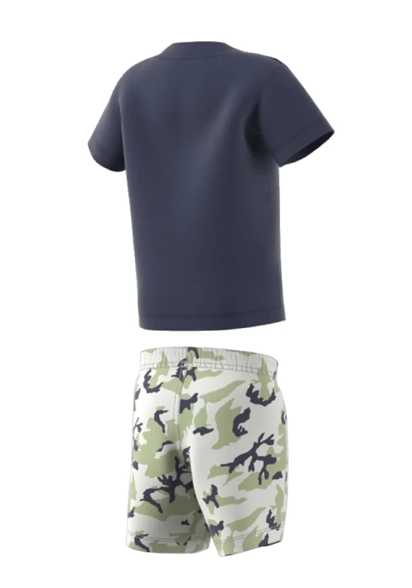 Completo Set Adidas Originals Shanav camouflage indigo e verde composto da t shirt in cotone a manica corta e stampa flower logo, bermuda con elastico in vita e dettaglio pittogramma