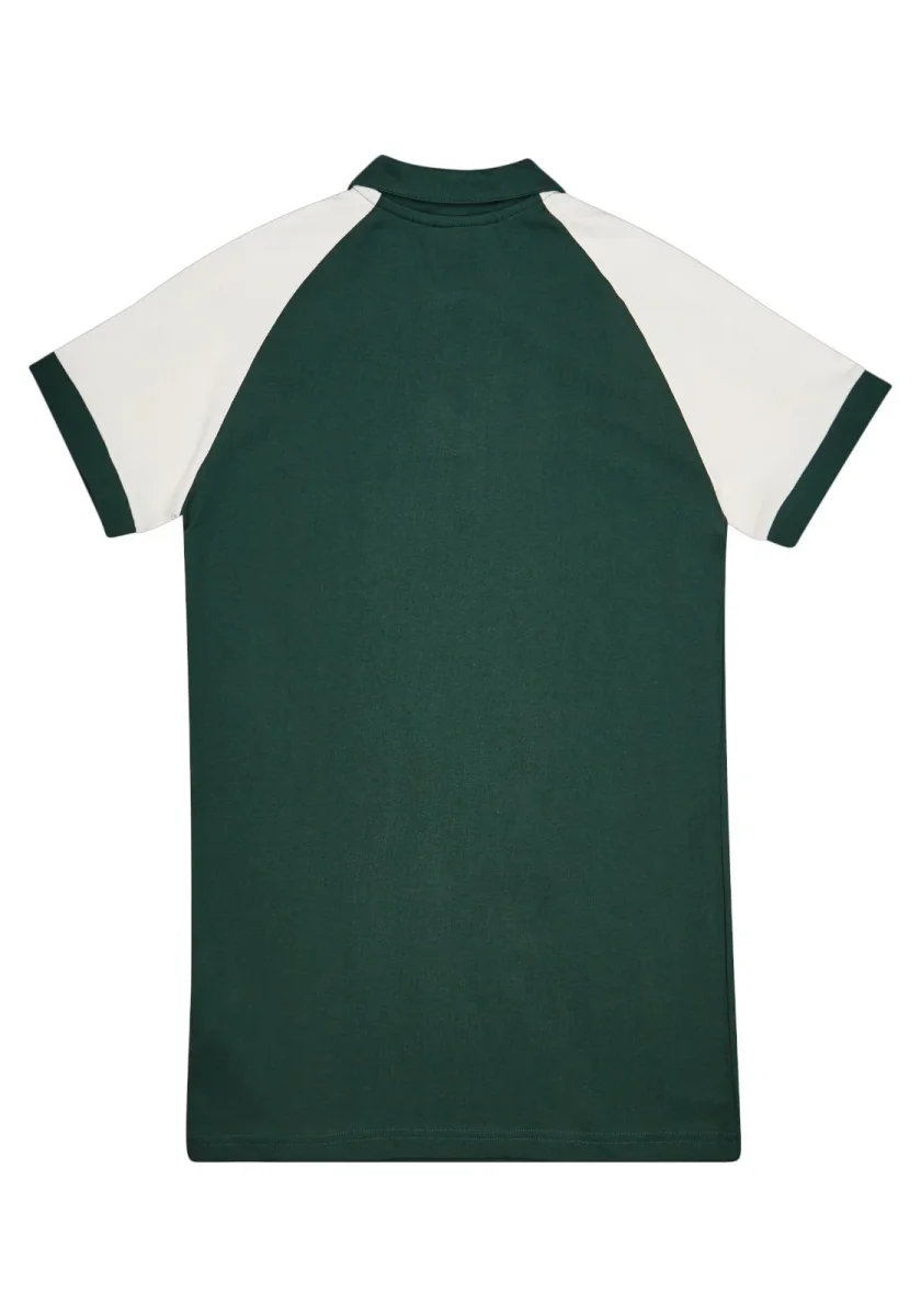 Polo adidas Originals in stile rétro, colore verde bosco con maniche a contrasto bianco panna e iconiche 3 strisce adidas sulle spalle. Logo Trefoil ricamato sul petto e chiusura a due bottoni. Un mix perfetto di eleganza sportiva e comfort casual.