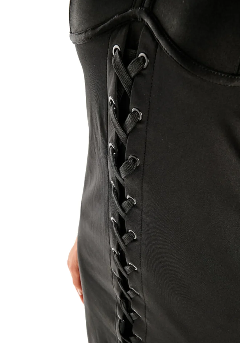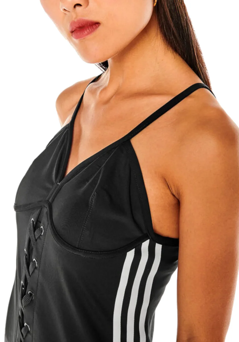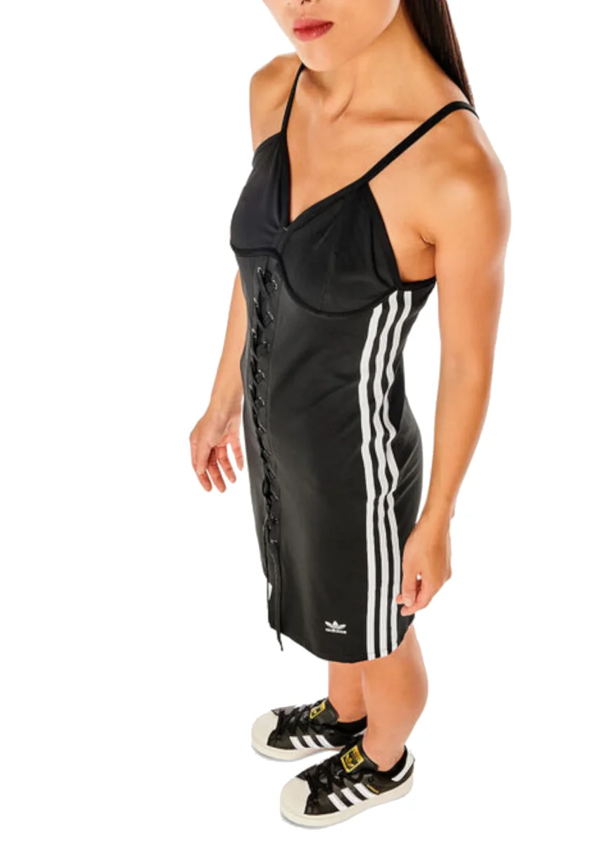 Vestito adidas con dettaglio chiusura a lacci e tre linee bianche ai lati di esso.