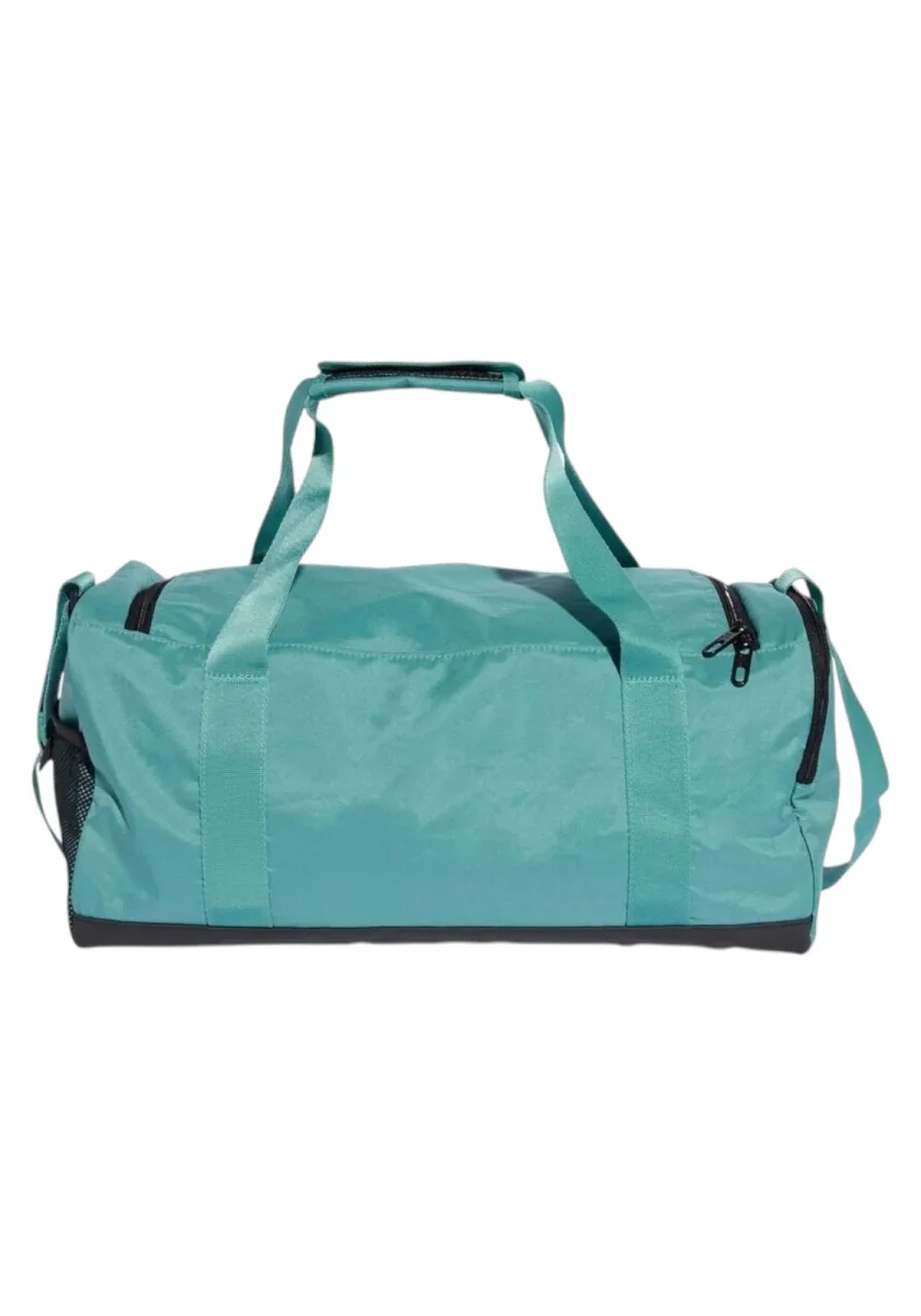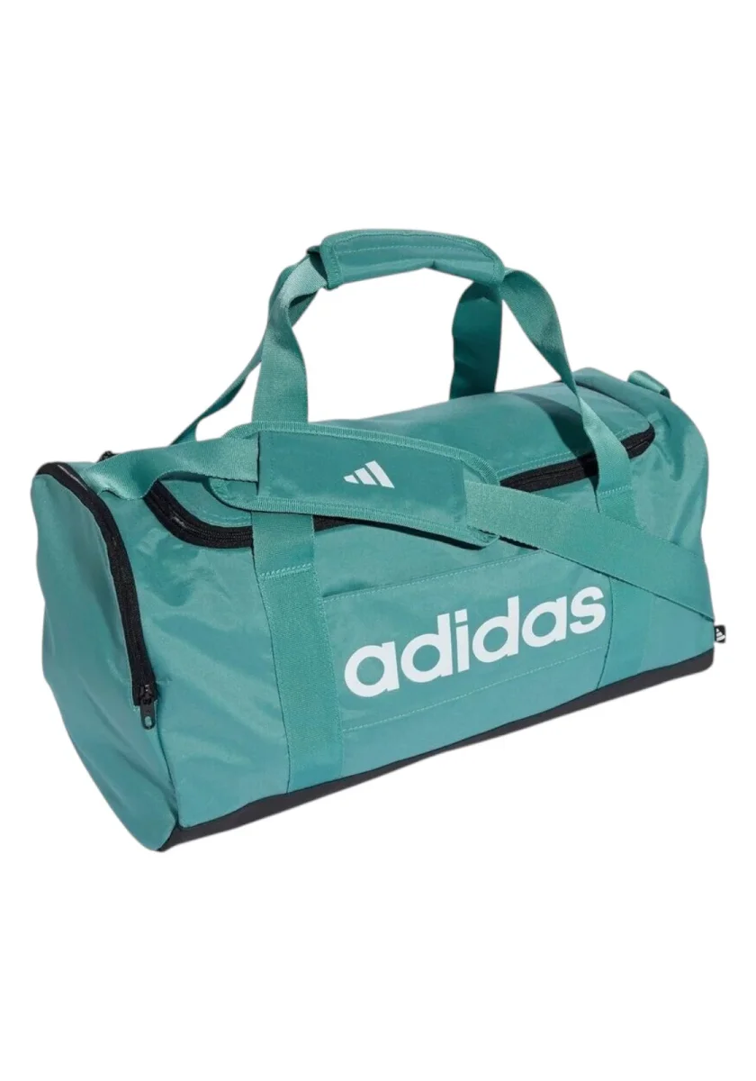 Borsa sportiva Adidas in tessuto resistente, colore verde acqua con dettagli neri. Dotata di manici rinforzati, tracolla regolabile e removibile, tasche laterali con zip e rete portaoggetti. Logo adidas stampato a contrasto sul davanti per uno stile sportivo e moderno. Perfetta per palestra, viaggi o tempo libero.