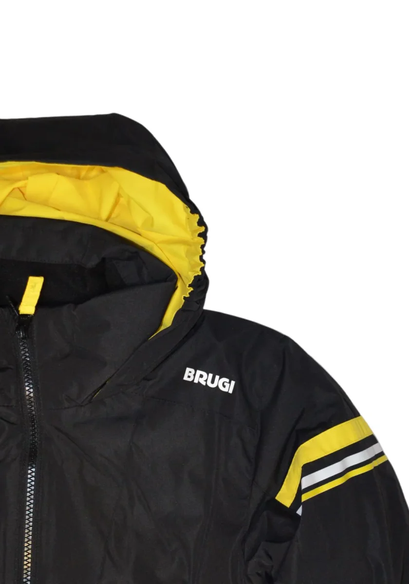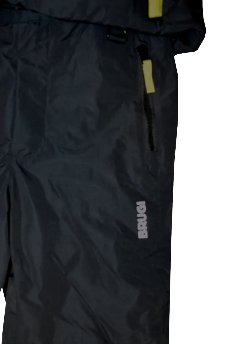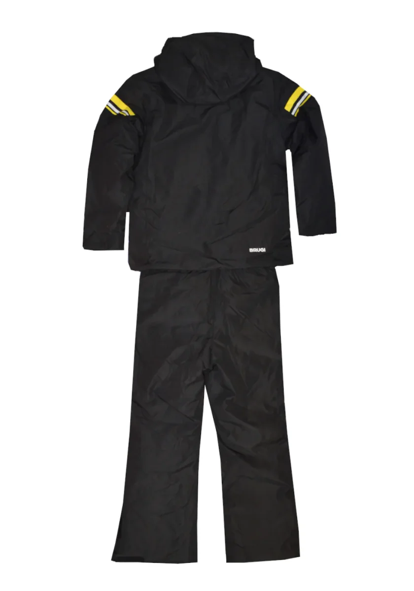 Completo sci, giacca dietro dritto, chiusura con cerniera a vista, cappuccio fisso e ripiegabile all’interno del collo, interno collo in tricot, fondo maniche dritto con alamaro di regolazione e polso interno, tasca sul carre’ parte sinistra con cerniera, due tasche basse con cerniera, taschino porta ski pass su manica sinistra con cerniera, tasca interna, gonnellina interna antineve, fondo giacca regolabile con coulisse. pantaloni con bretelle staccabili, elastico in vita fianchi, tasche con cerniera nascosta, gambaletto antineve interno