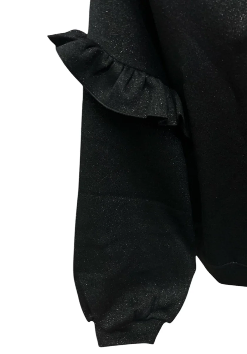 Felpa nera con leggera finitura glitterata, impreziosita da volant sulle maniche. Vestibilità comoda con polsini elasticizzati, ideale per un look casual ma femminile.