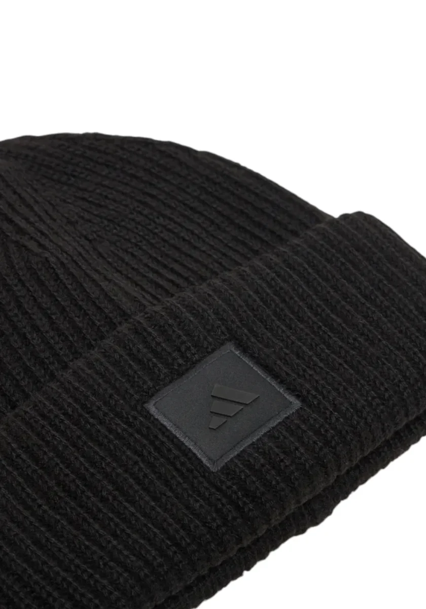 Cappello beanie adidas in maglia a coste nera con ampio risvolto e patch logo tono su tono sul davanti. Morbido e caldo, vestibilità confortevole: perfetto per le giornate fredde e gli outfit casual.