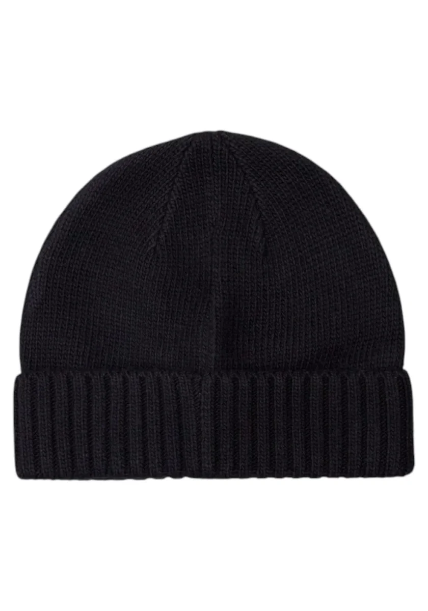 Cappello modello beanie in maglia misto lana, con vestibilità one size. Presenta risvolto a coste, finitura fluted e logo GUESS in metallo o metallo-placcato sul fronte.
