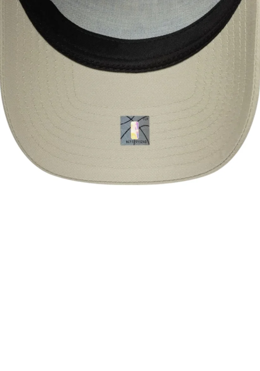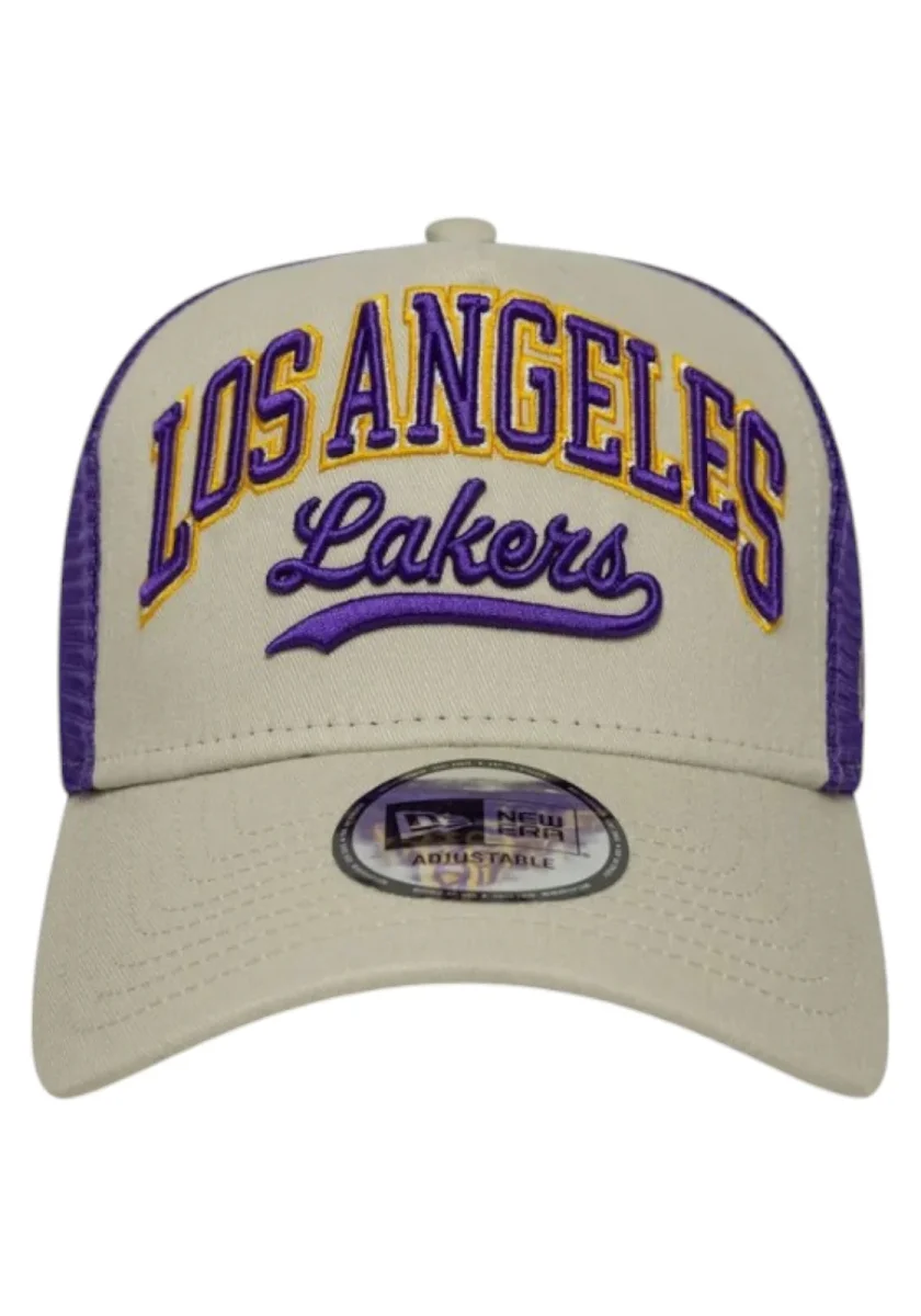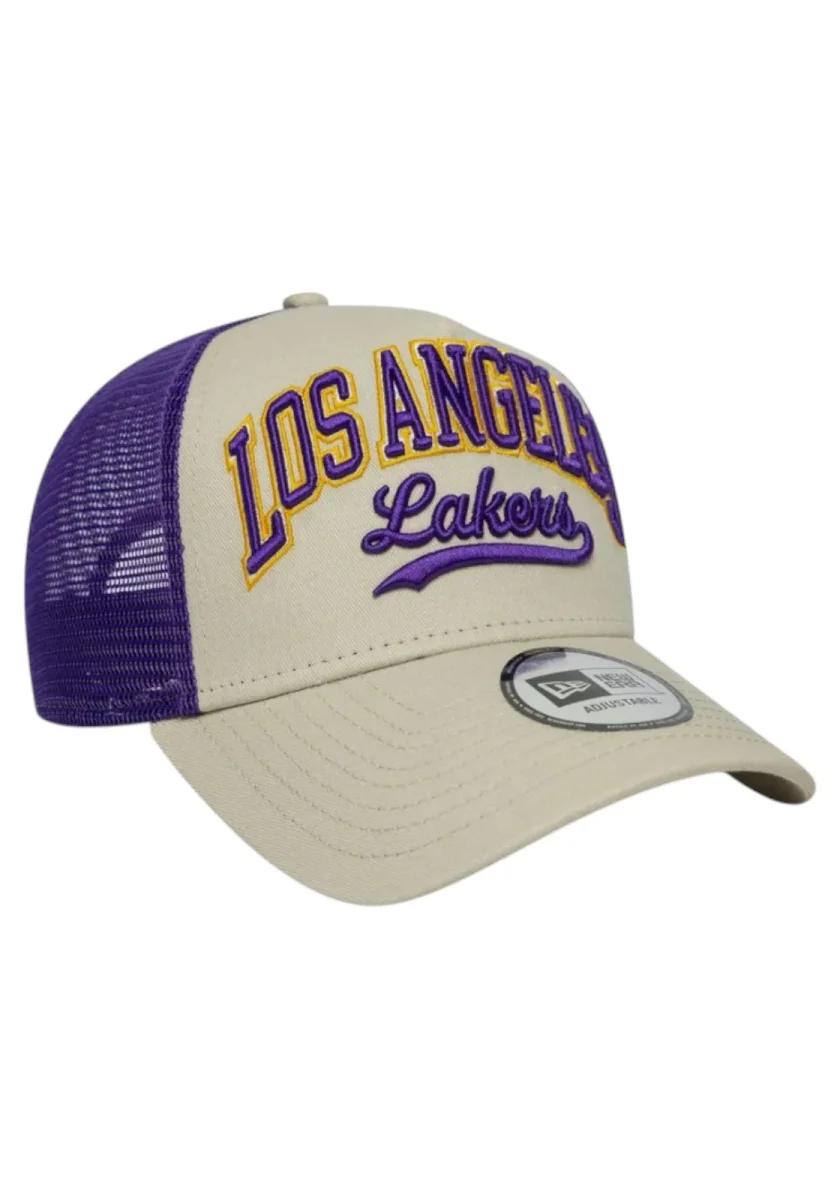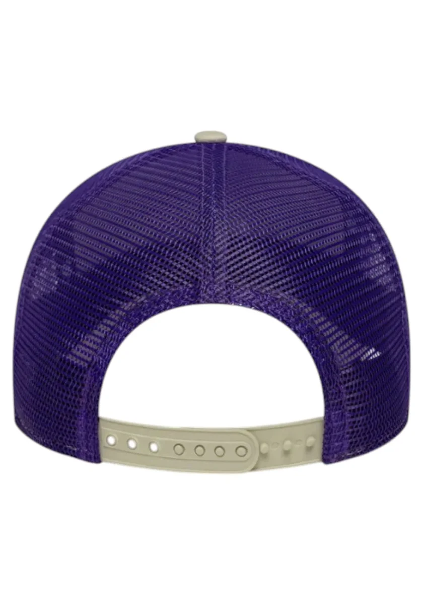 Cappellino trucker regolabile beige con rete viola e logo Los Angeles Lakers ricamato in giallo e viola. Perfetto per i fan NBA.