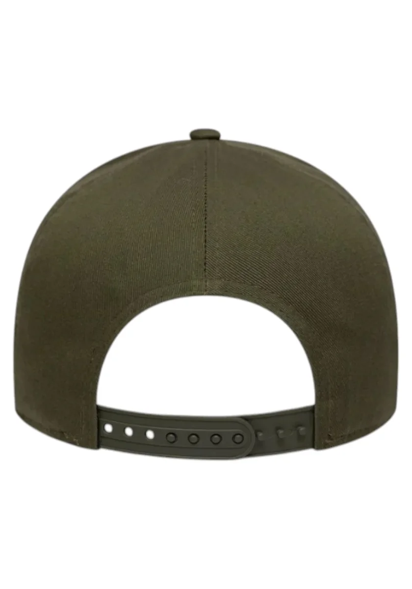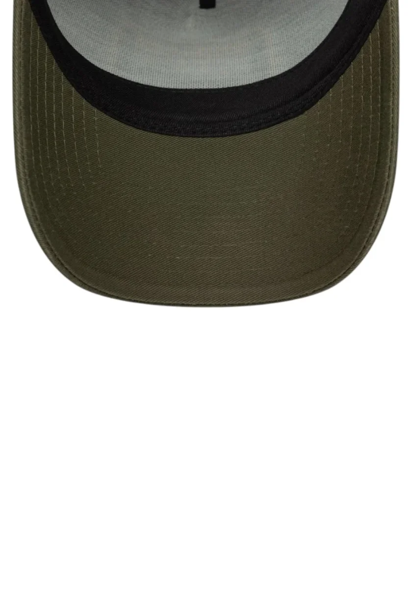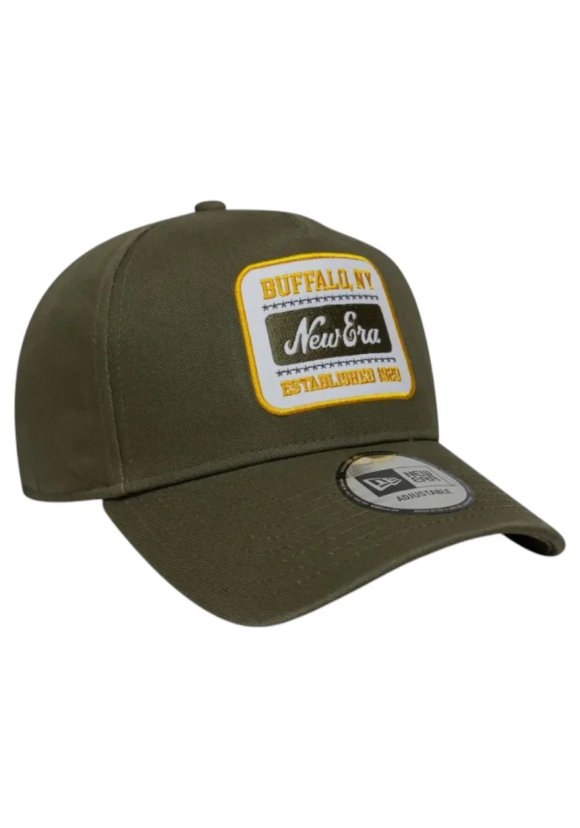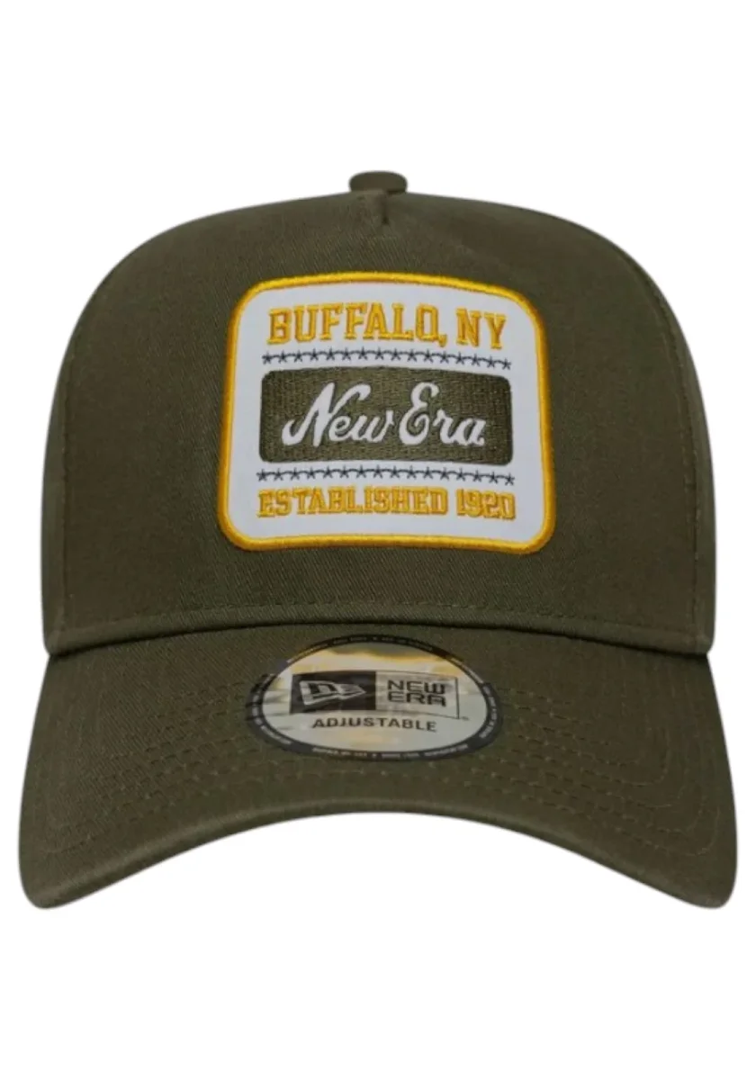 Cappellino New Era regolabile verde oliva con visiera curva e patch frontale ricamata Buffalo, NY – New Era – Established 1920 in bianco, giallo e verde militare. Chiusura snapback sul retro.