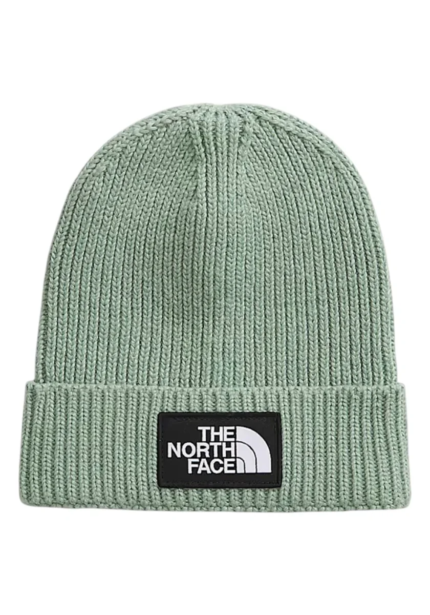 Cappello The North Face in maglia a coste (6–14 anni), color verde salvia. Modello con risvolto e logo ricamato in patch frontale, perfetto per look casual e outdoor.