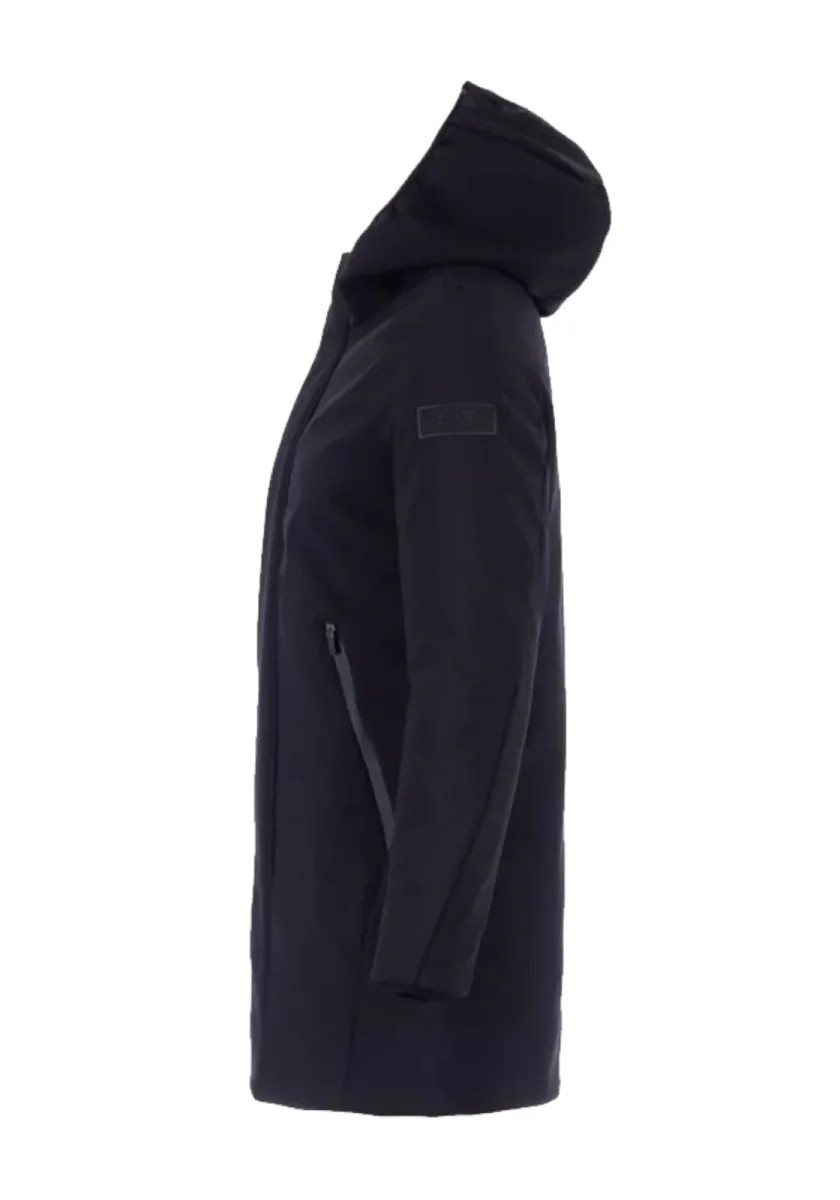 Cappotto a collo alto, realizzato in maglia rasata di lana vergine.