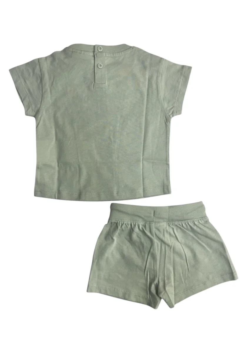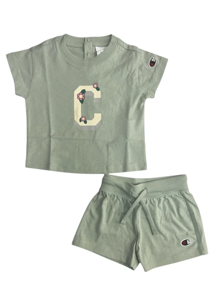 Completo da bambina Champion composto da t-shirt verde salvia con stampa floreale a forma di C e pantaloncini coordinati con coulisse. Realizzato in cotone morbido per il massimo comfort e ideale per il tempo libero.