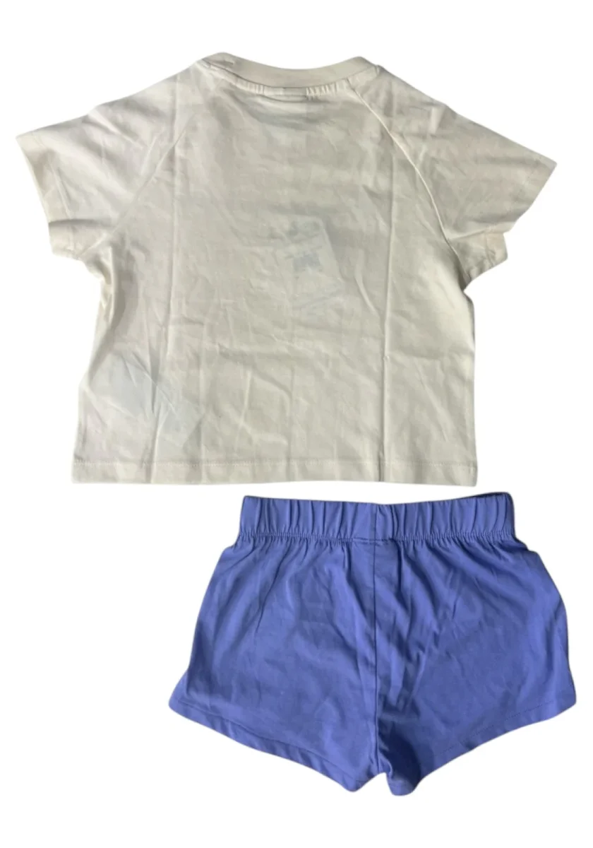 Completo sportivo Champion da bambina, composto da t-shirt color crema con logo frontale e pantaloncini lilla in cotone elasticizzato. Comodo e fresco, perfetto per le giornate estive.