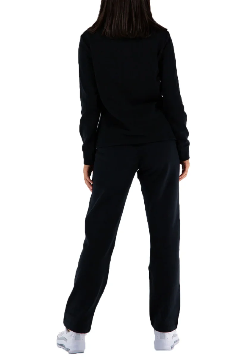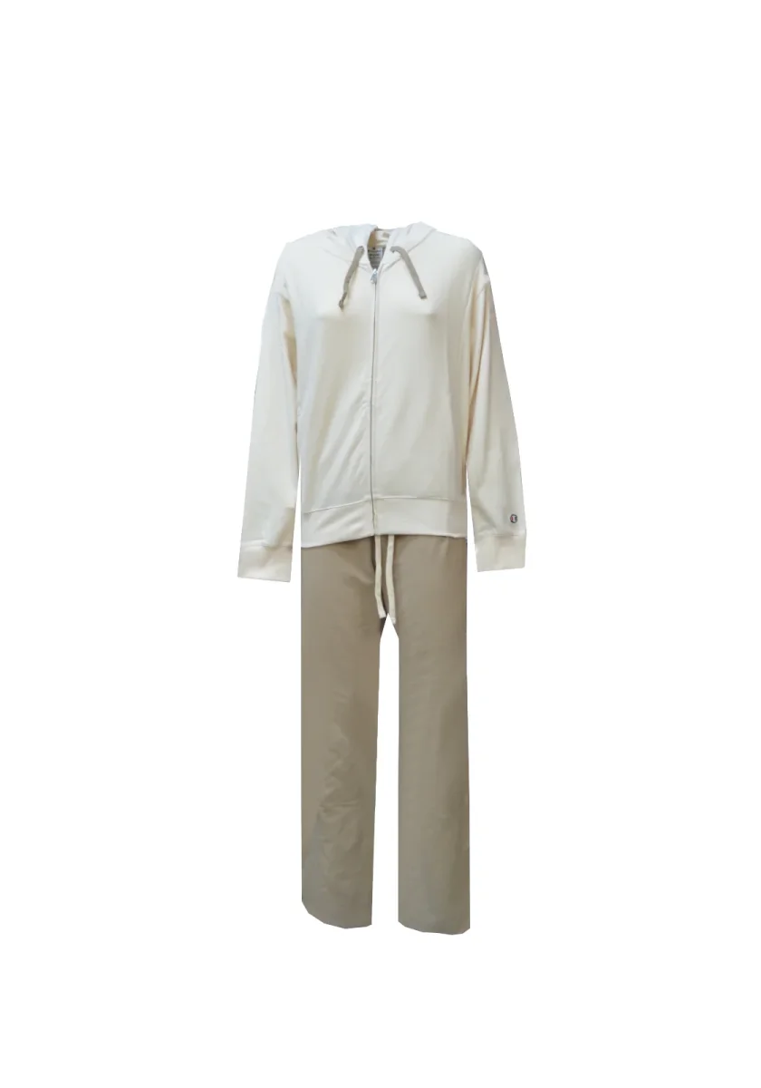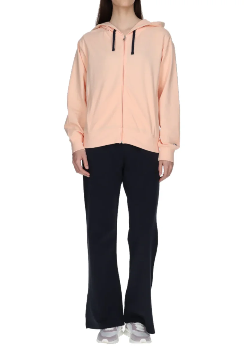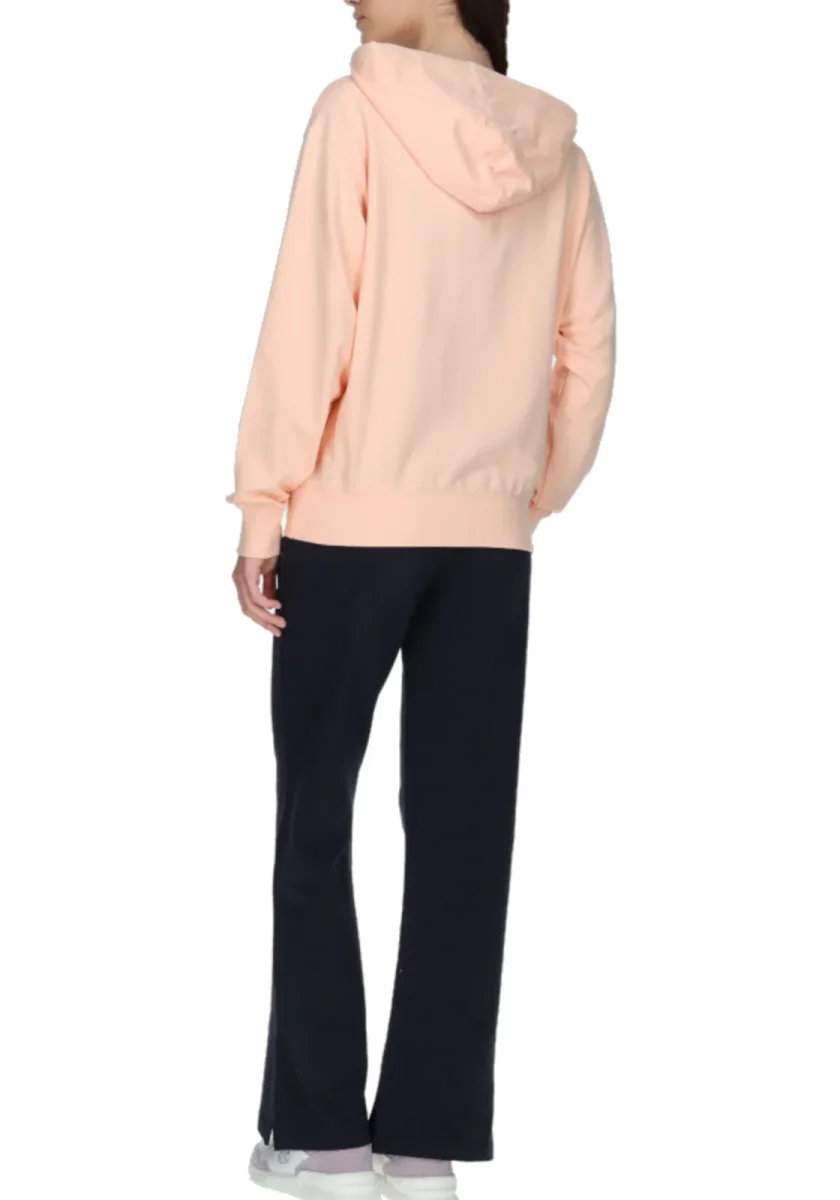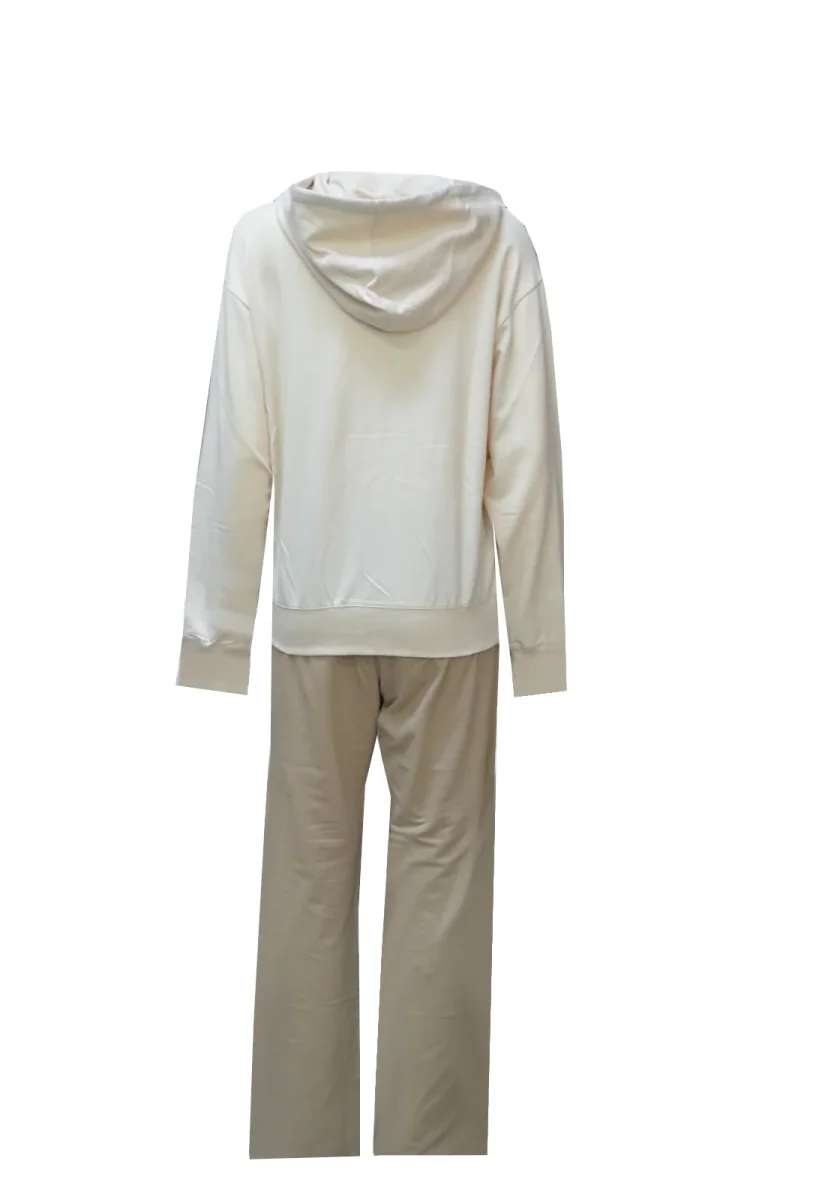 La felpa presenta cappuccio con coulisse, chiusura con cerniera e due tasche anteriori, mentre il pantalone, dal taglio largo, ha due spacchetti laterali e vita elastica.