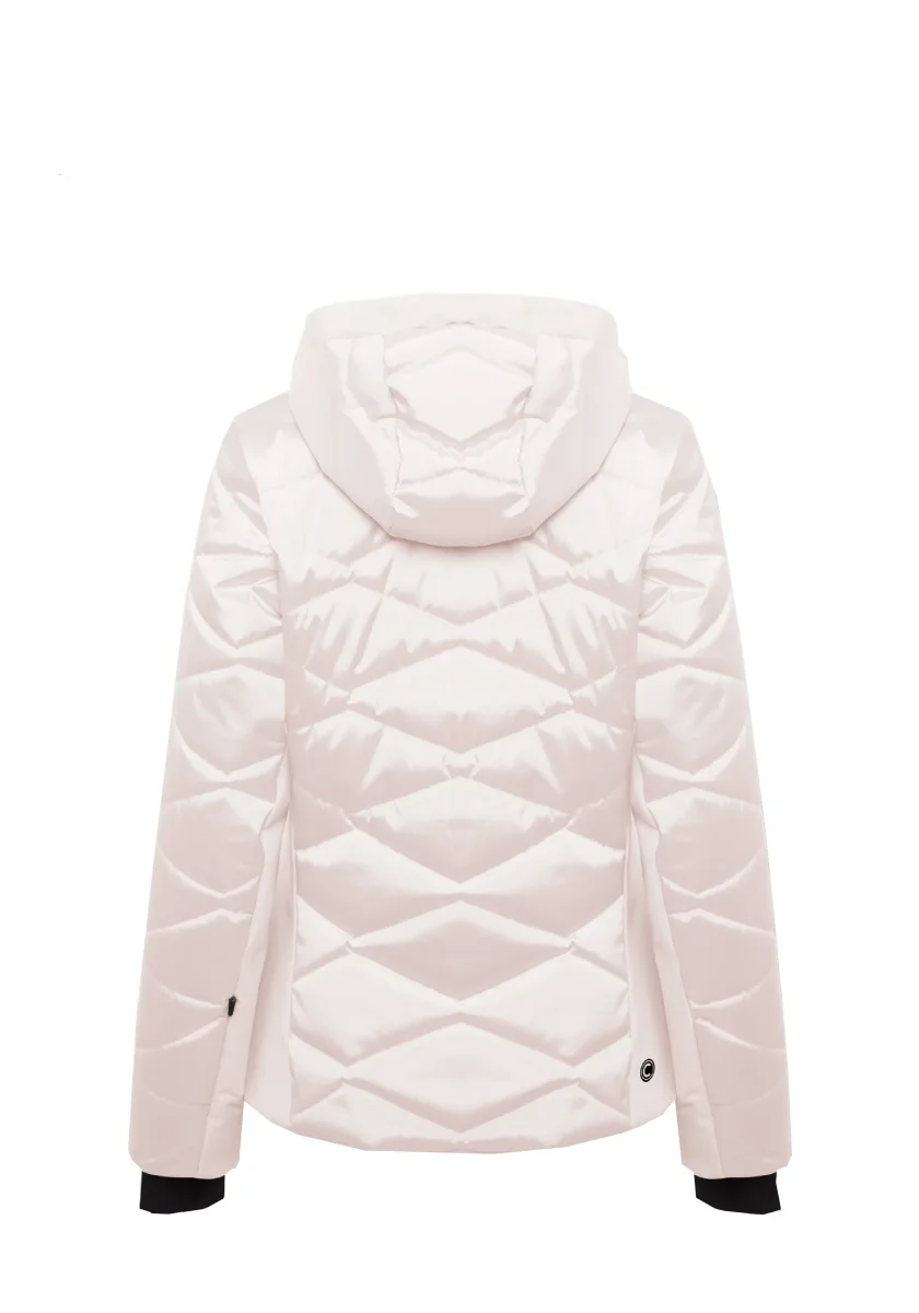 Questo modello, dal taglio molto femminile, alterna a trapunti geometrici inserti lisci in tessuto bielastico riciclato impermeabile (20.000mm) e traspirante (20.000 gr/m2/24H).