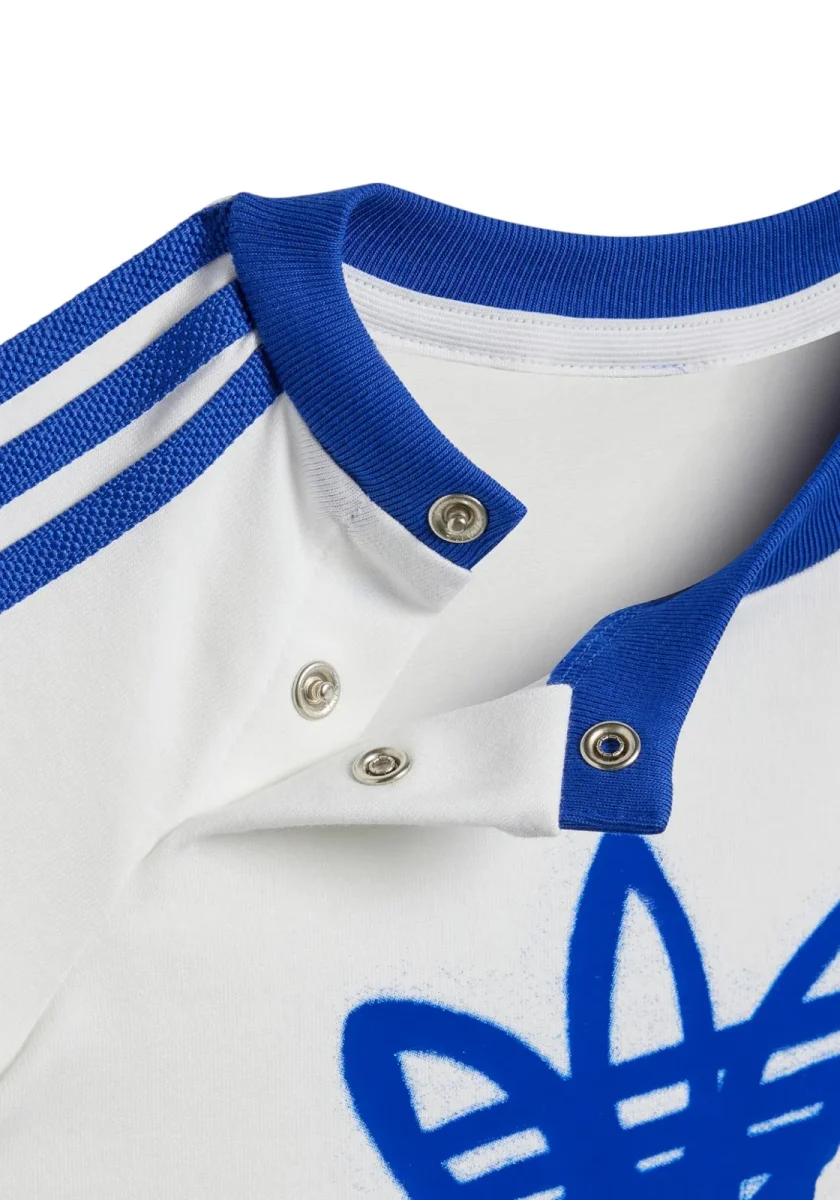 Completo per bambini con t-shirt bianca e pantaloncini blu, con personaggi Disney (Mickey, Goofy, Donald) e logo Adidas graffiti. Girocollo con bottoni a pressione.