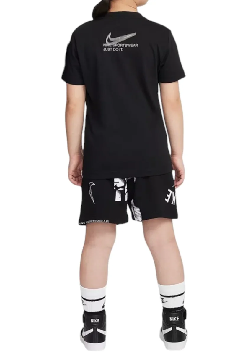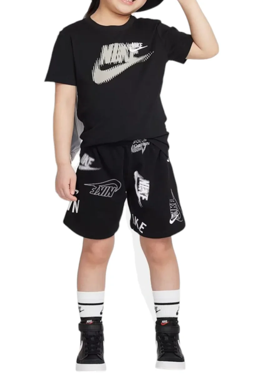 Completo sportivo da bambini firmato Nike, composto da t-shirt nera con maxi logo frontale effetto pixel e stampa sul retro, abbinata a shorts in cotone con elastico in vita e stampa logo multiforme a contrasto. Ideale per un look street e dinamico.