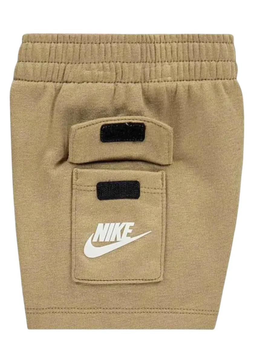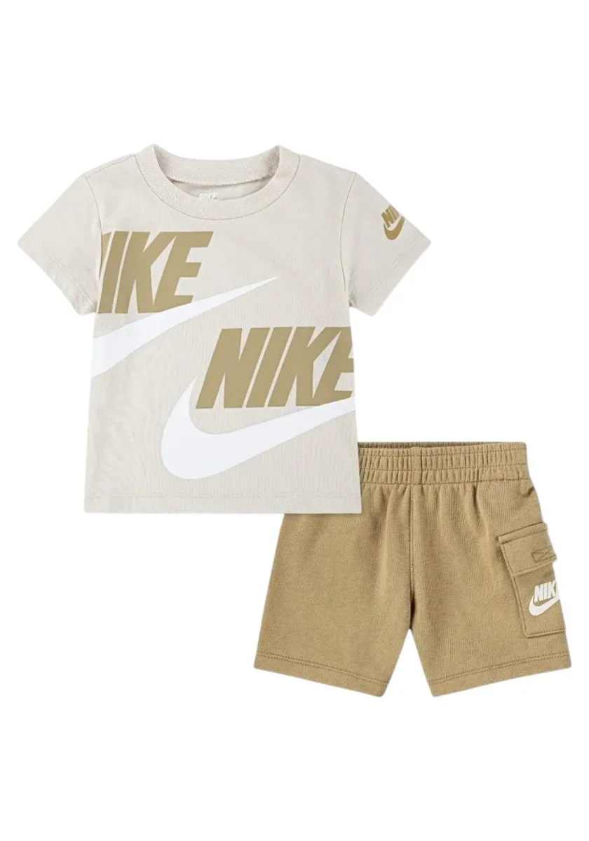 Questo è un set sportivo per bambini firmato Nike, composto da una t-shirt e un pantaloncino corto. La t-shirt è di colore beige con una stampa grafica oversize del logo Nike Swoosh in bianco e marrone chiaro, creando un effetto dinamico e moderno. Il pantaloncino è in una tonalità sabbia, con vita elasticizzata e una pratica tasca laterale dotata di patta, arricchita dal logo Nike in bianco.