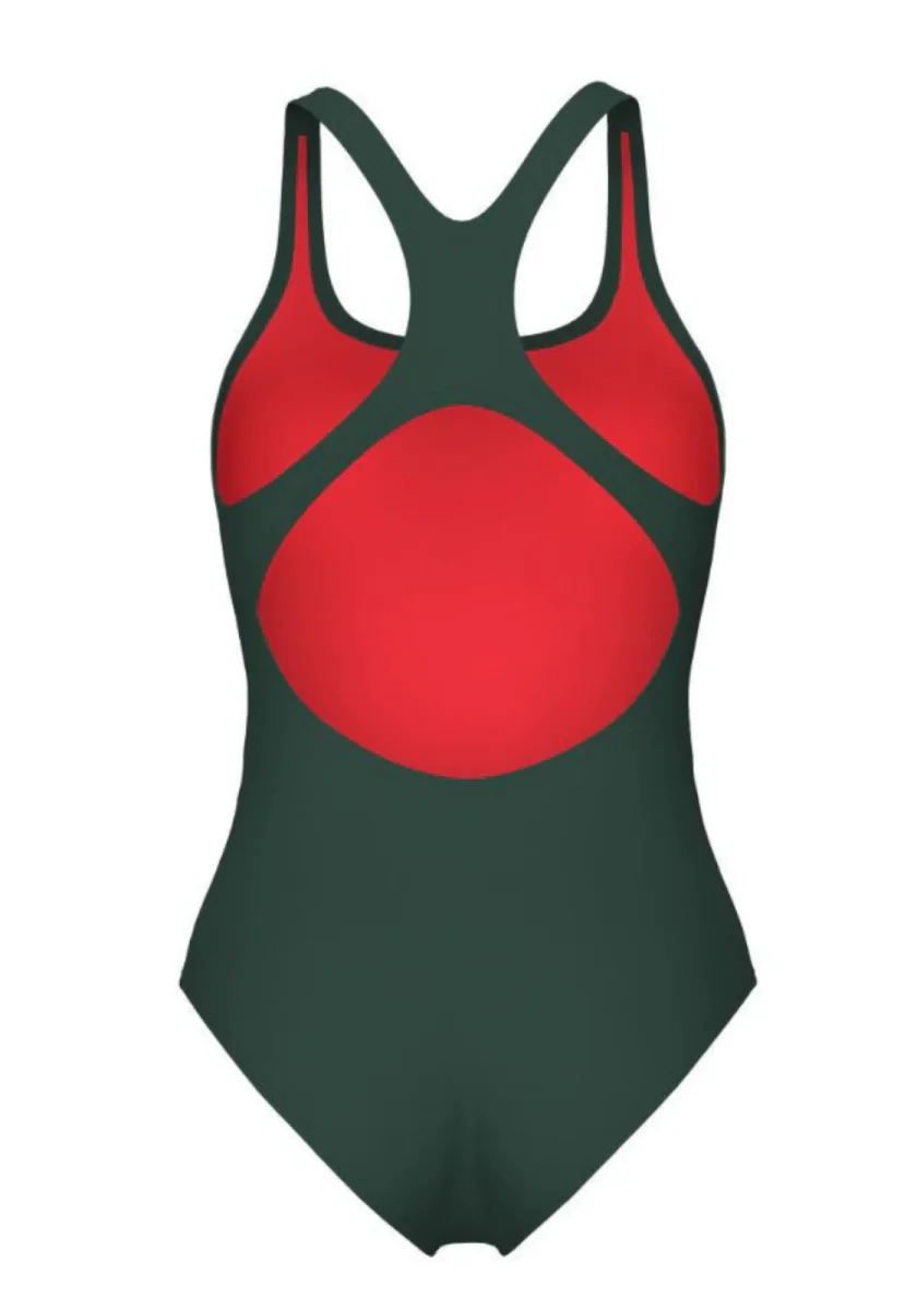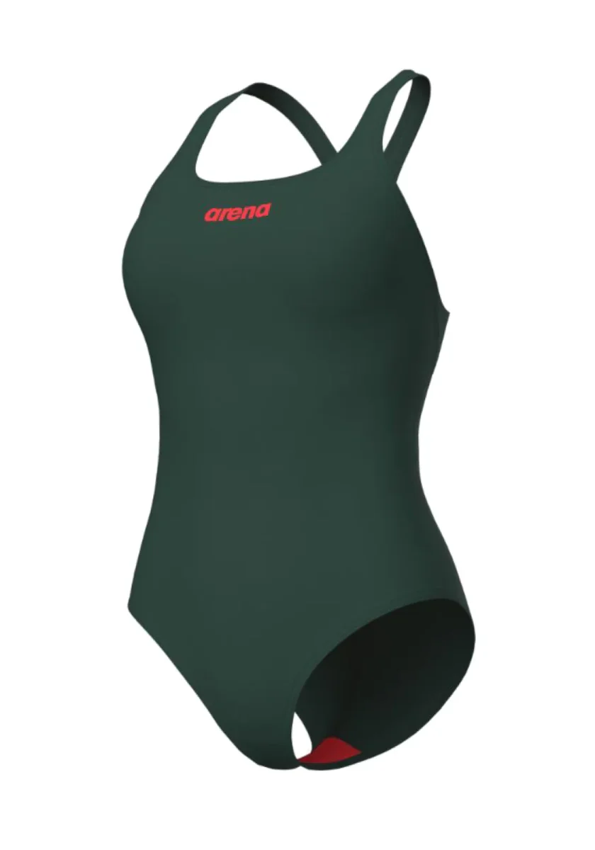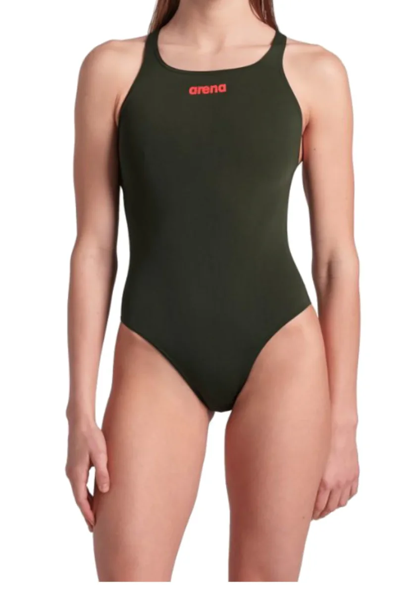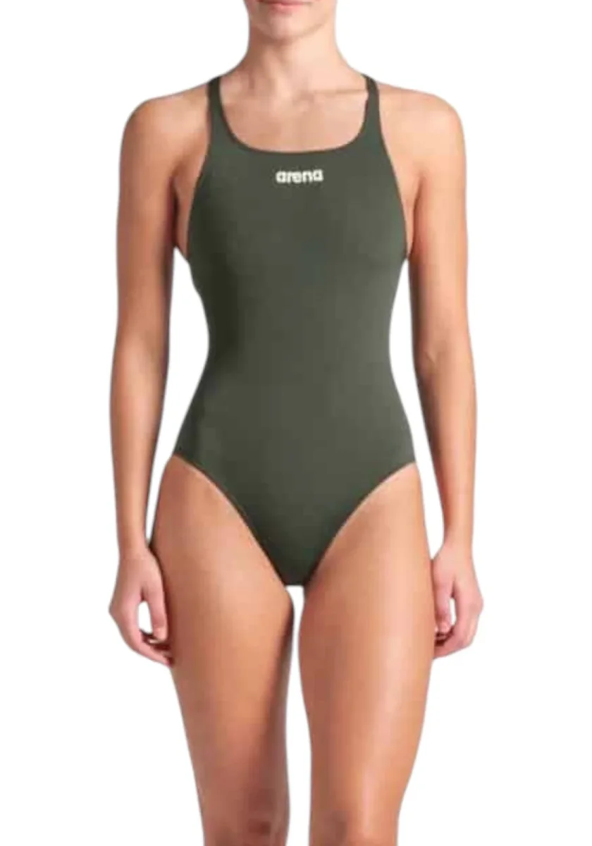 Costume intero da donna Arena in colore verde militare, con design sportivo e dorso olimpionico aperto per massima libertà di movimento. Ideale per allenamenti e nuoto intensivo, realizzato in tessuto resistente al cloro e a rapida asciugatura.
