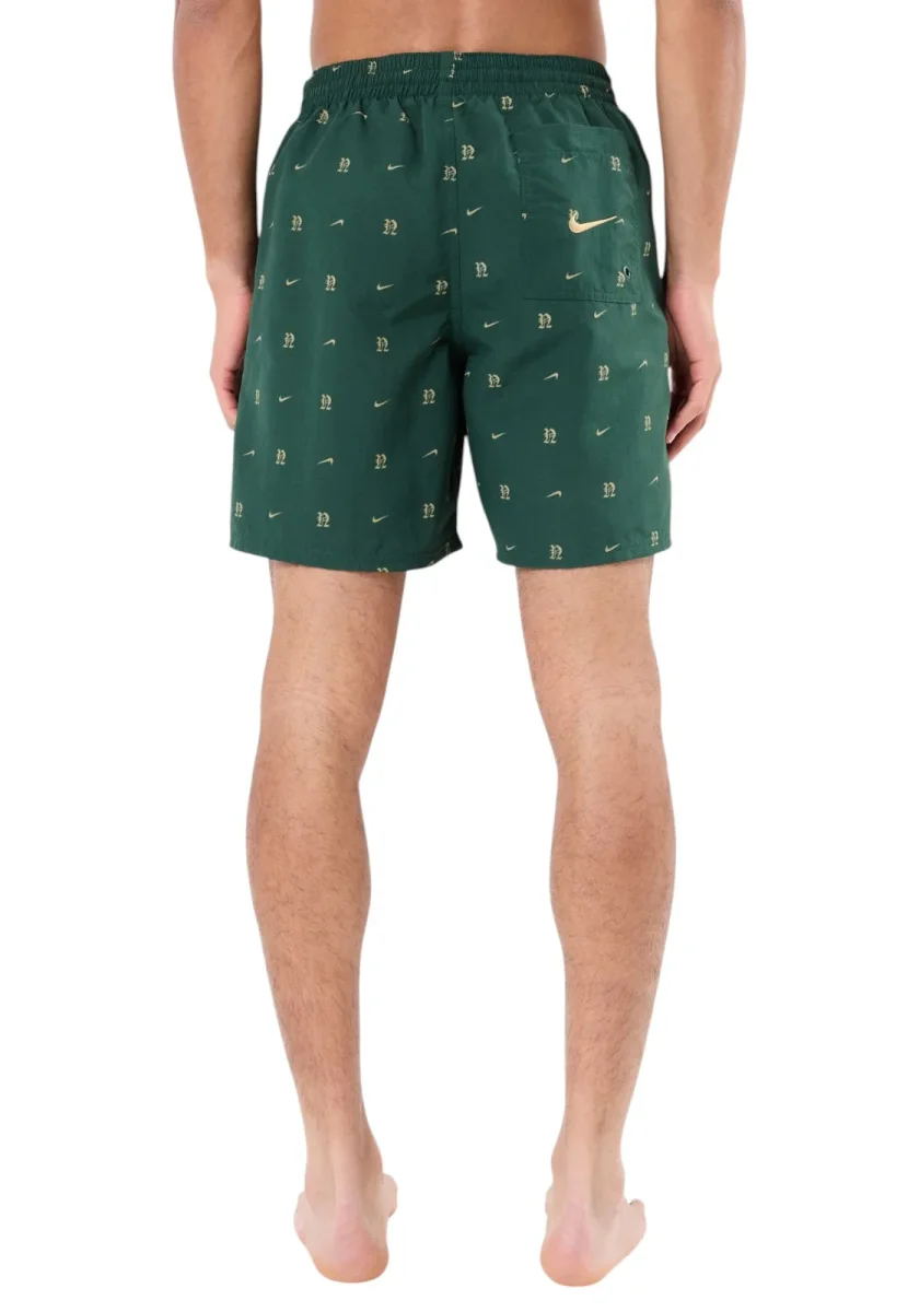 Costume da bagno Nike verde con fantasia N e mini Swoosh dorati, vita elasticizzata con laccetto regolabile e taschino posteriore. Ideale per un look sportivo e distintivo in spiaggia o in piscina.