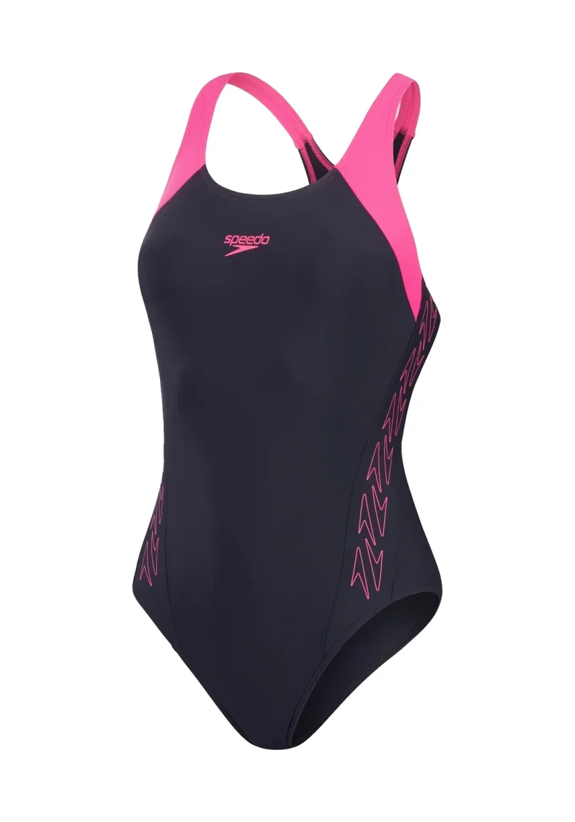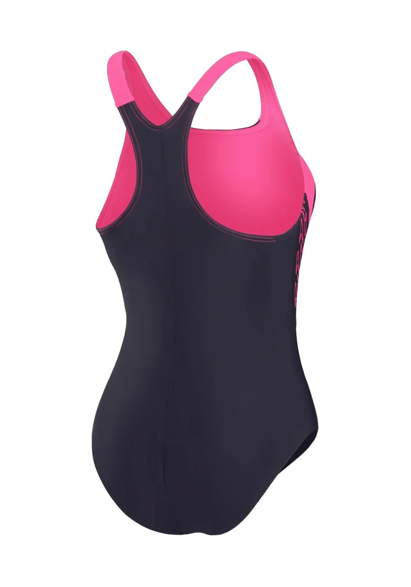 In omaggio al marchio Speedo, questo modello sportivo Muscleback presenta inserti laterali dalla forma accattivante che richiamano la stampa -frantumata- del logo Boom nelle tonalità intense del rosa e del blu.
