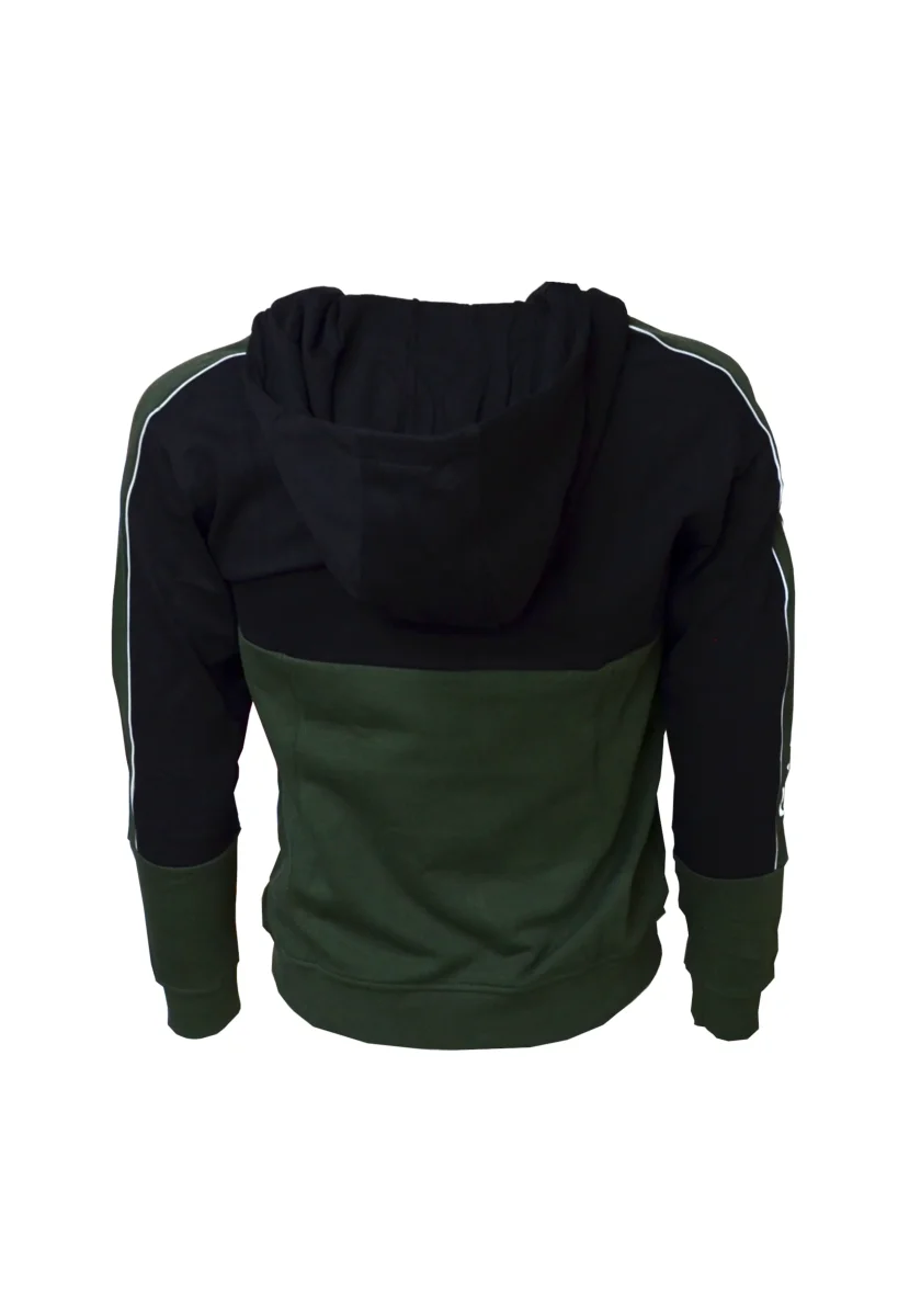 la tasca a marsupio, la scritta sul braccio, la mezza zip e il cappuccio.