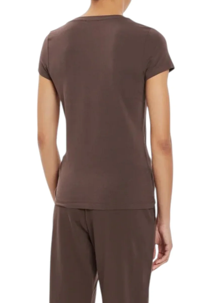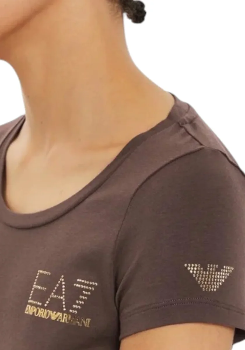 T-shirt in cotone elasticizzato marrone con vestibilità aderente. Presenta logo EA7 Emporio Armani con dettagli dorati e applicazioni di micro borchie sul petto e sulla manica sinistra. Girocollo classico e maniche corte per un look sportivo ed elegante.