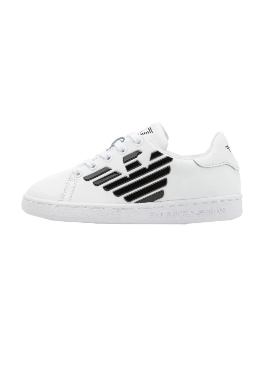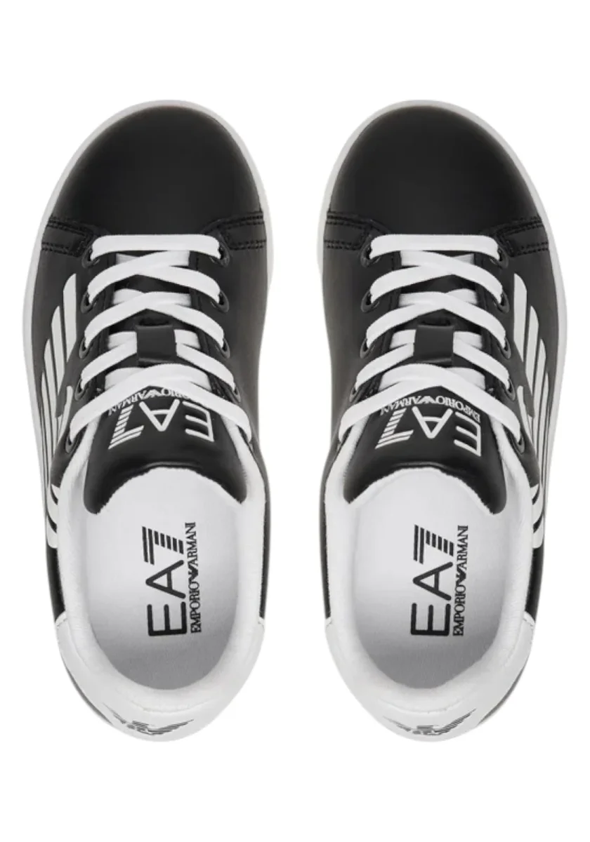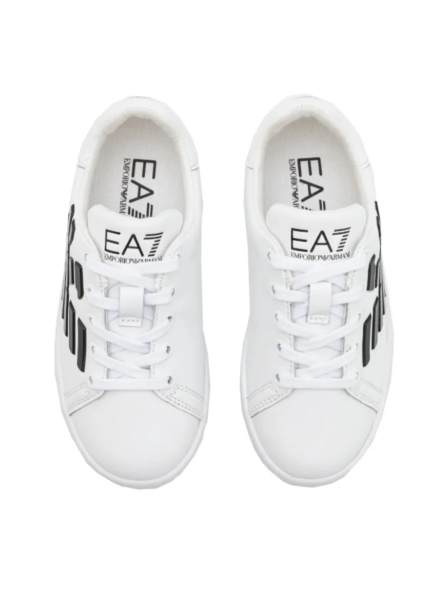 Sneakers basse EA7 da bambino in pelle con logo laterale bianco-nere.