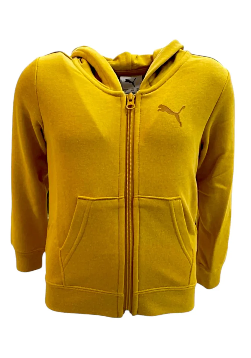 Felpa con cappuccio Puma da bambino in verde oliva. Chiusura a zip, tasche frontali e logo Puma tono su tono sul petto. Dettaglio stampato su manica sinistra Puma Original Sportswear. Ideale per look sportivi e confortevoli.