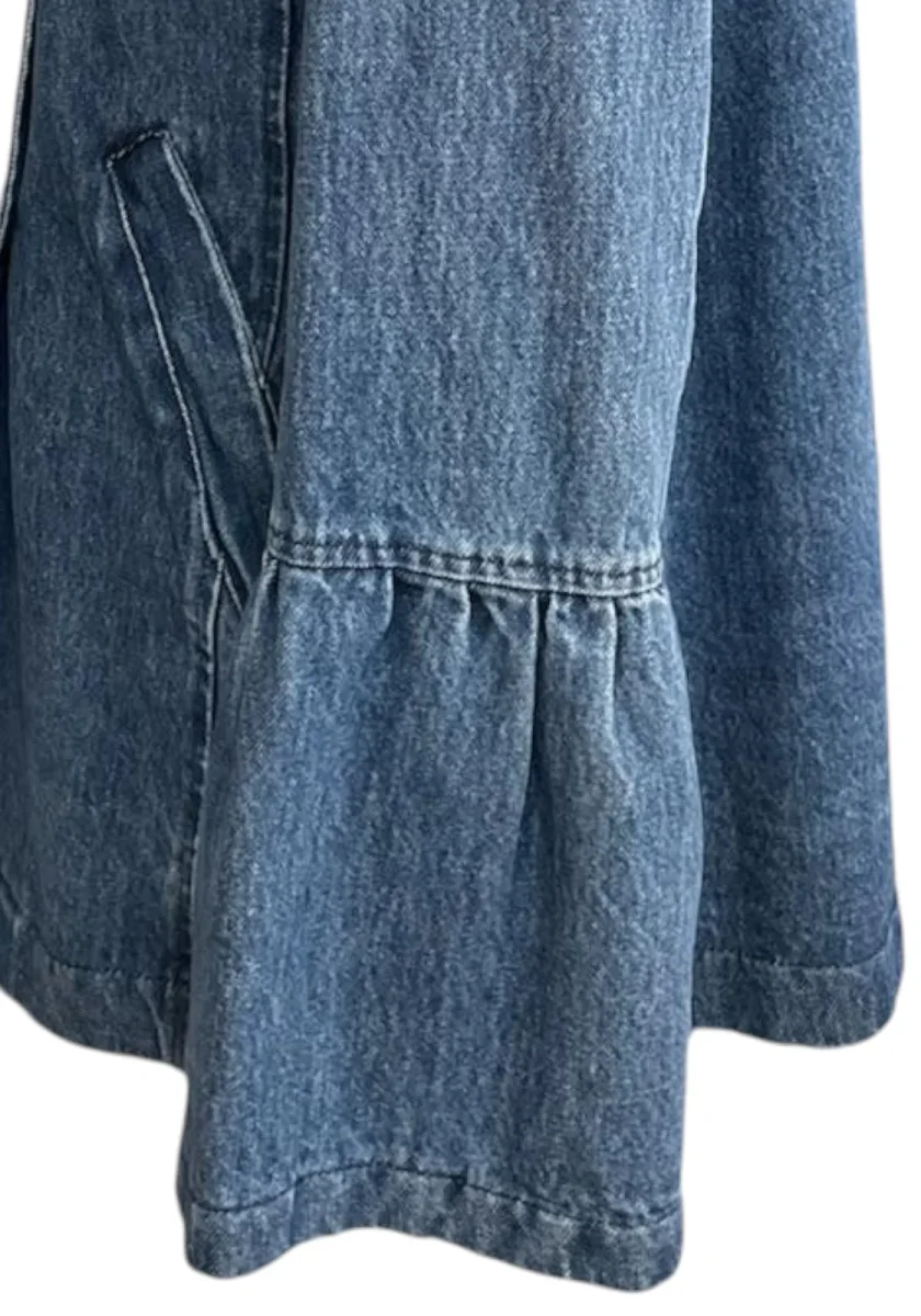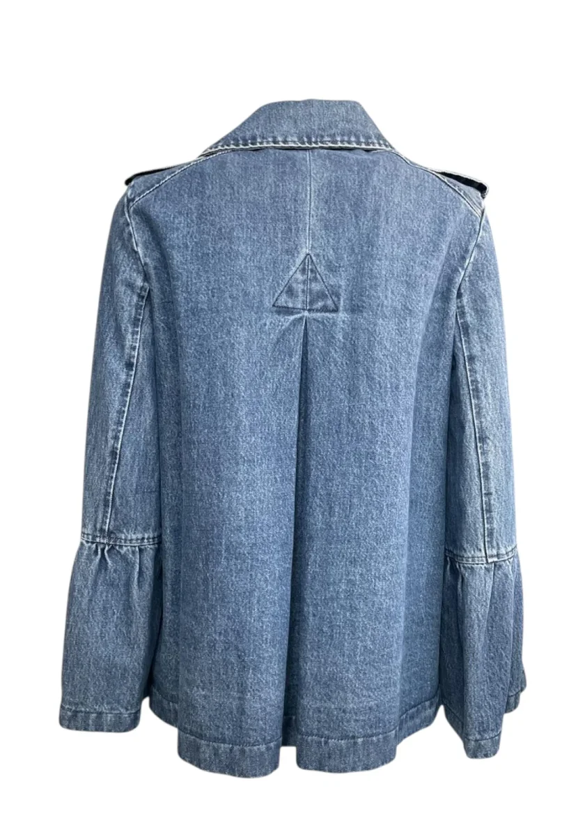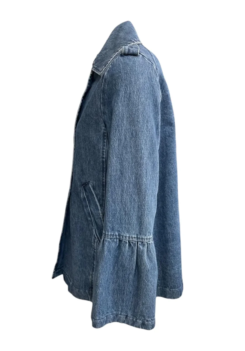 Giacca corta modello trench realizzata in denim 100% cotone, con linea doppiopetto, colletto a rever e chiusura con bottoni. Il taglio leggermente oversize con spalla scesa offre una vestibilità comoda e moderna.