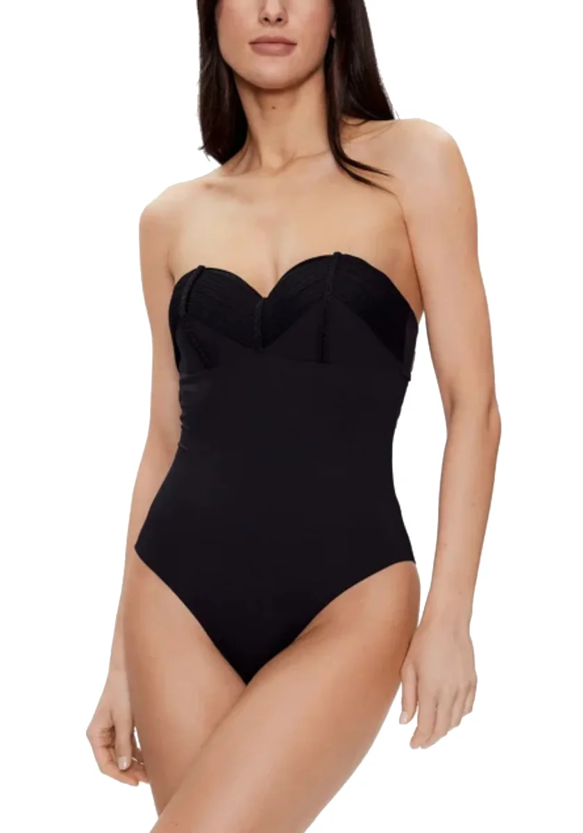 Monokini con scollatura a cuore dotato di imbottitura estraibile e laccetti removibili, in tessuto lycra nero.