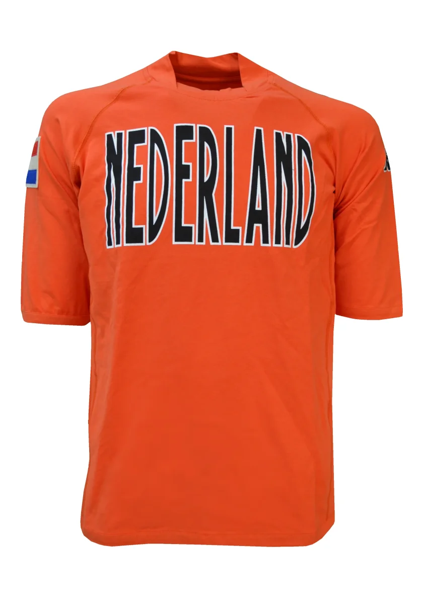 T-shirt da uomo in cotone, colorazione arancio e stampa -NEDERLAND- su tutto il petto della t-shirt.