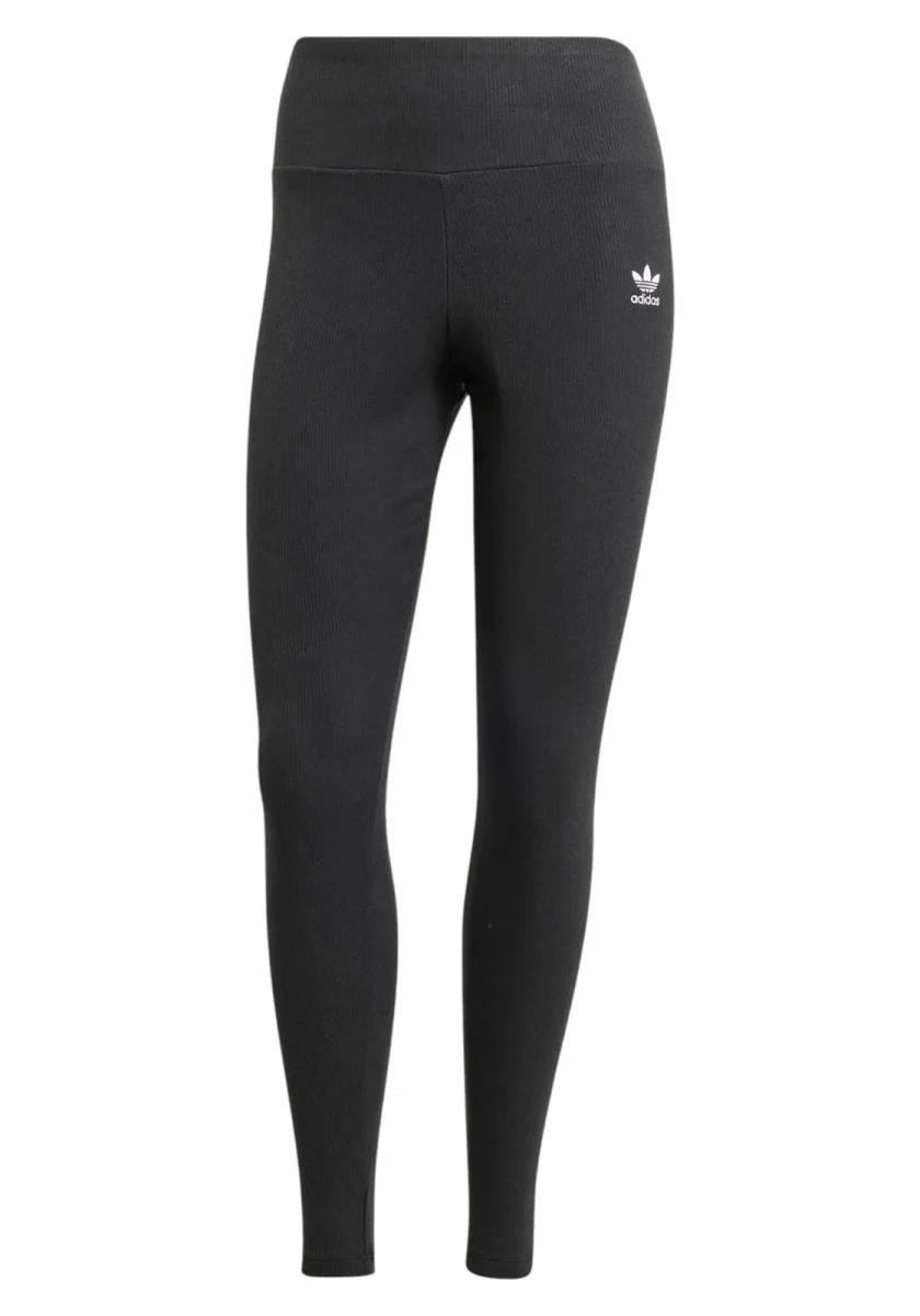 Leggings donna Adidas Originals in cotone elasticizzato nero, dal design a vita alta e fit aderente. Caratterizzati dal logo Trefoil bianco ricamato sulla gamba sinistra, sono ideali per un look sportivo e casual.