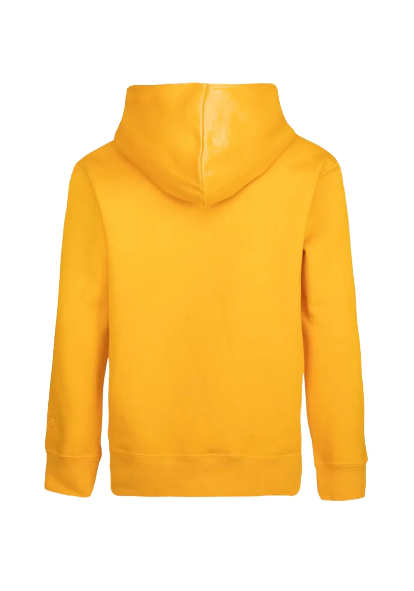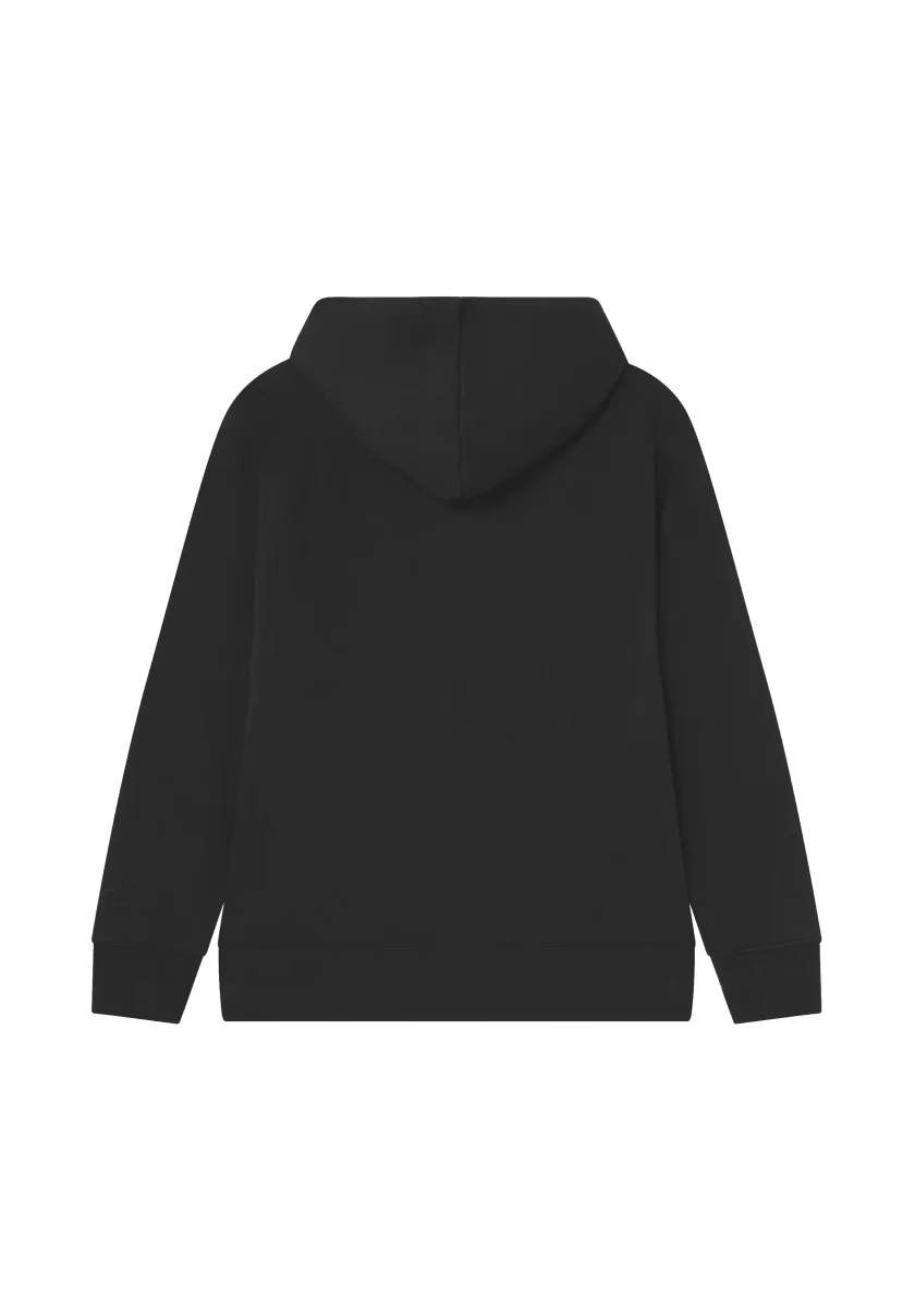 Felpa nera in cotone garzato, a maniche lunghe, cappuccio, girocollo, polsini e orlo a costine, tasca frontale.