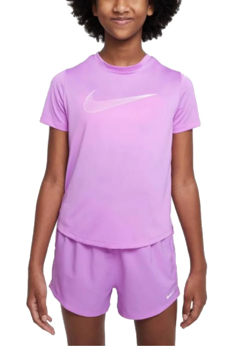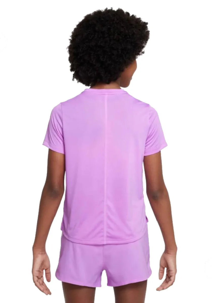 Morbida e leggera, la maglietta da tennis per bambina Nike Dri-FIT One offre libertà di movimento e traspirabilità per un comfort ideale in allenamento.