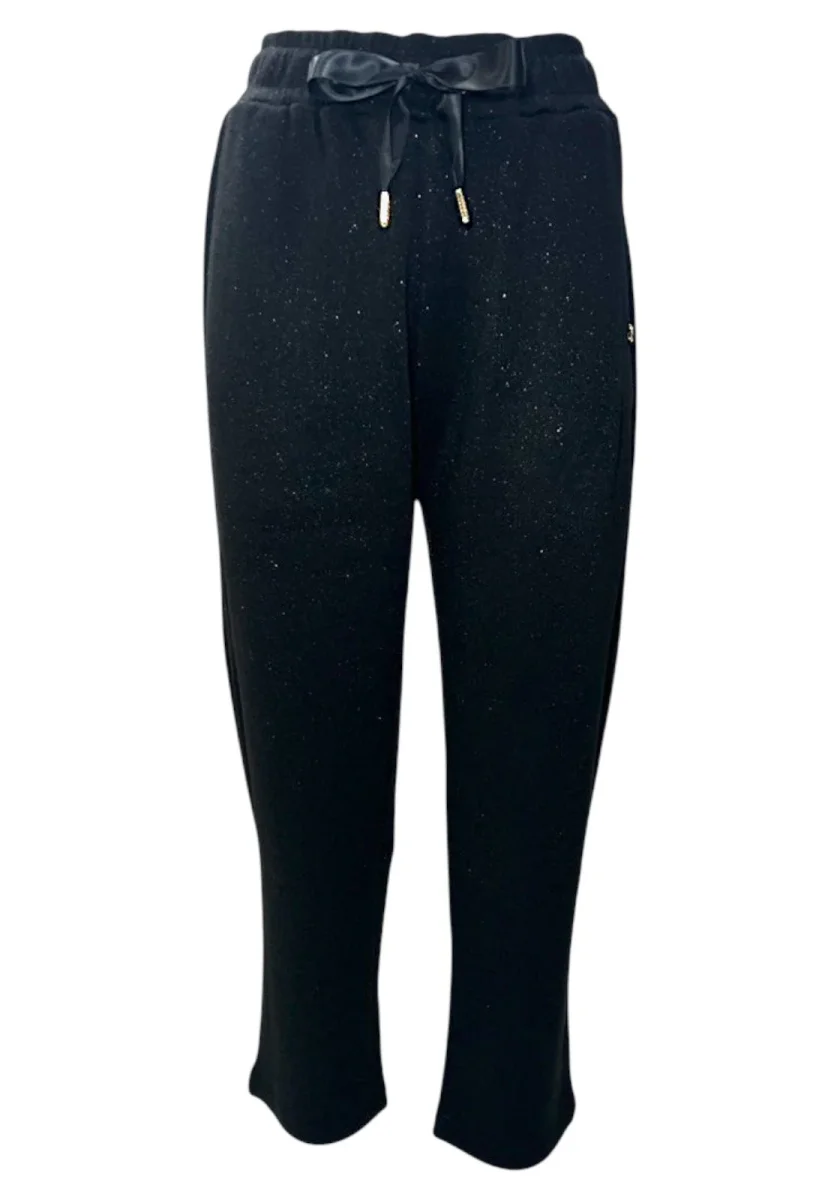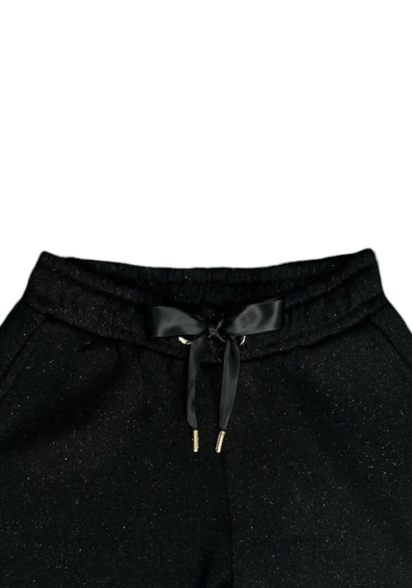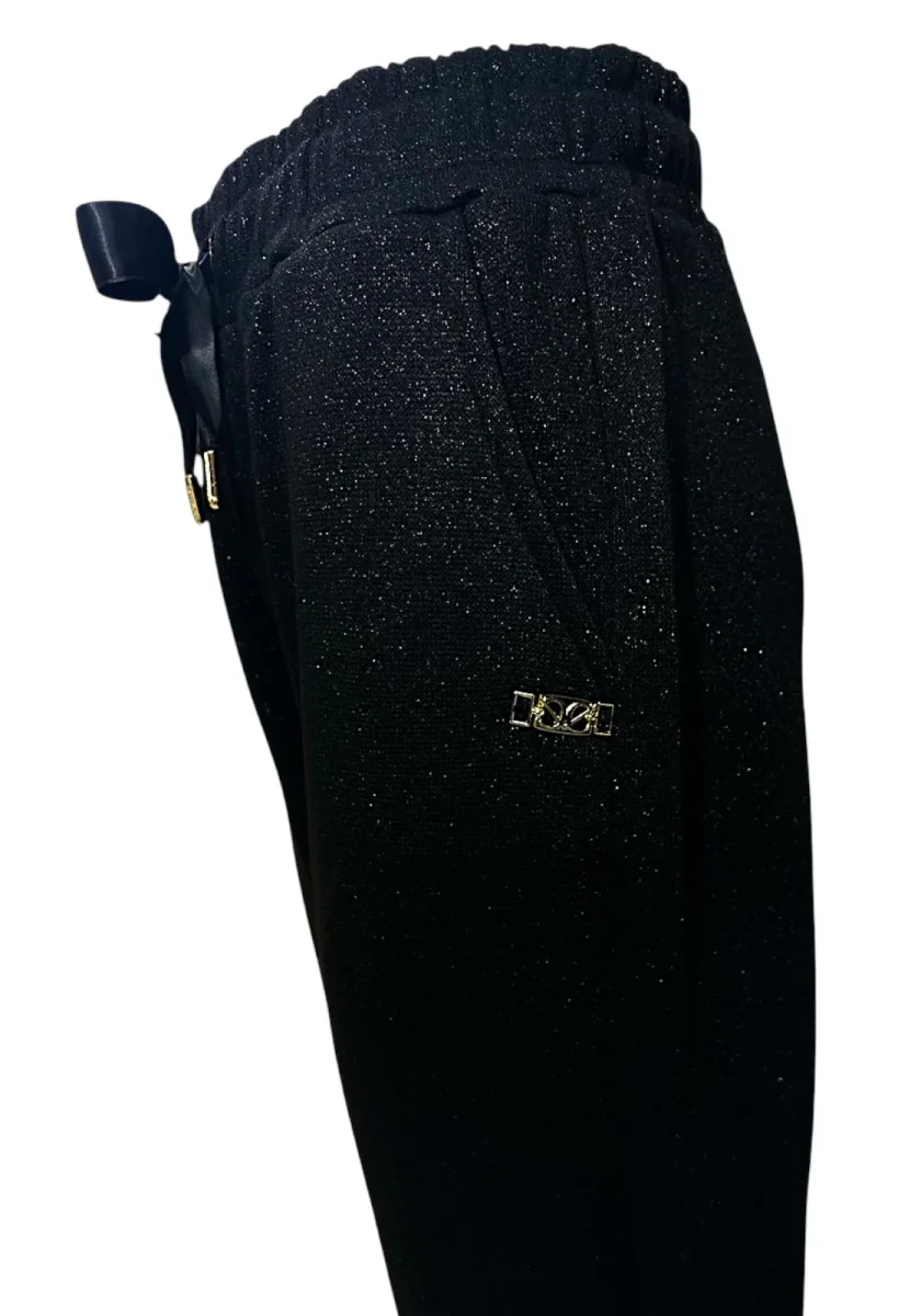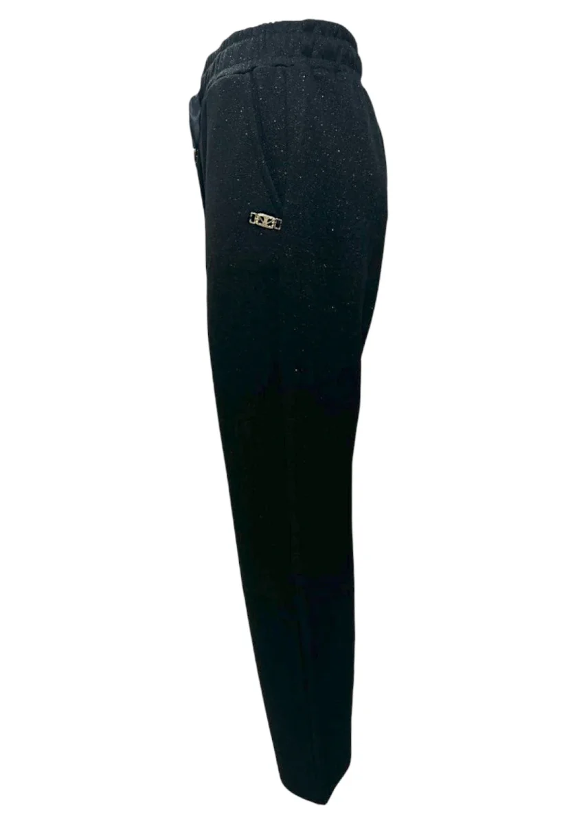 Pantalone jogger da donna in tessuto nero con filato lurex, elastico in vita e coulisse in raso con finalini dorati. Tasche laterali e dettaglio logo metallico sul fianco.