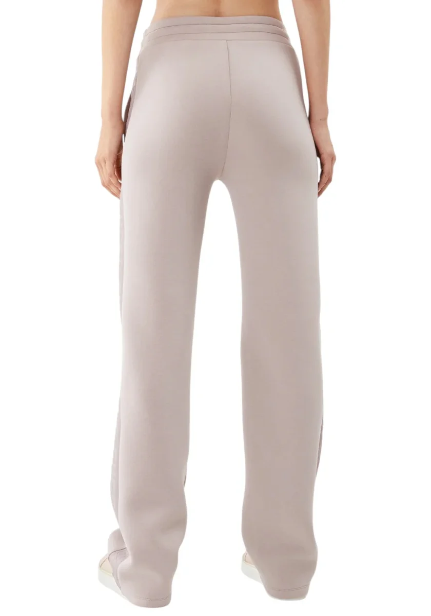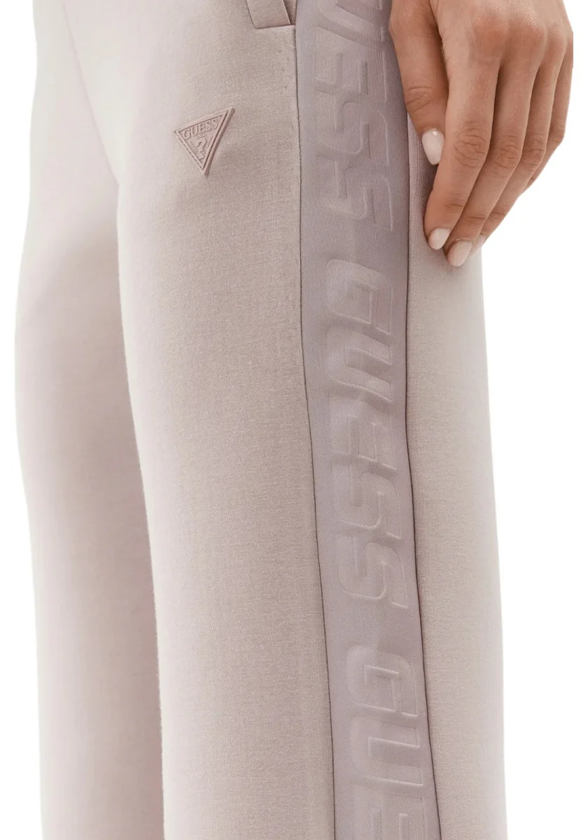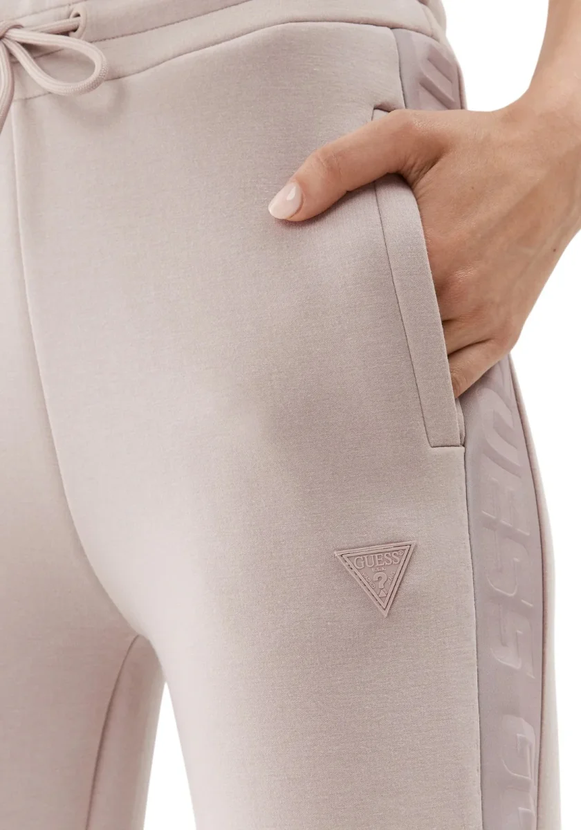 Pantaloni jogger GUESS da donna in morbido cotone rosa cipria, con fascia laterale logata tono su tono e coulisse regolabile. Ideali per un look comodo e raffinato.
