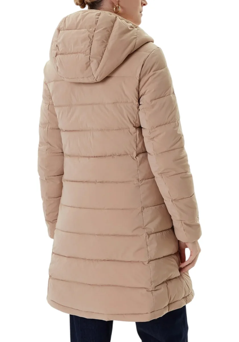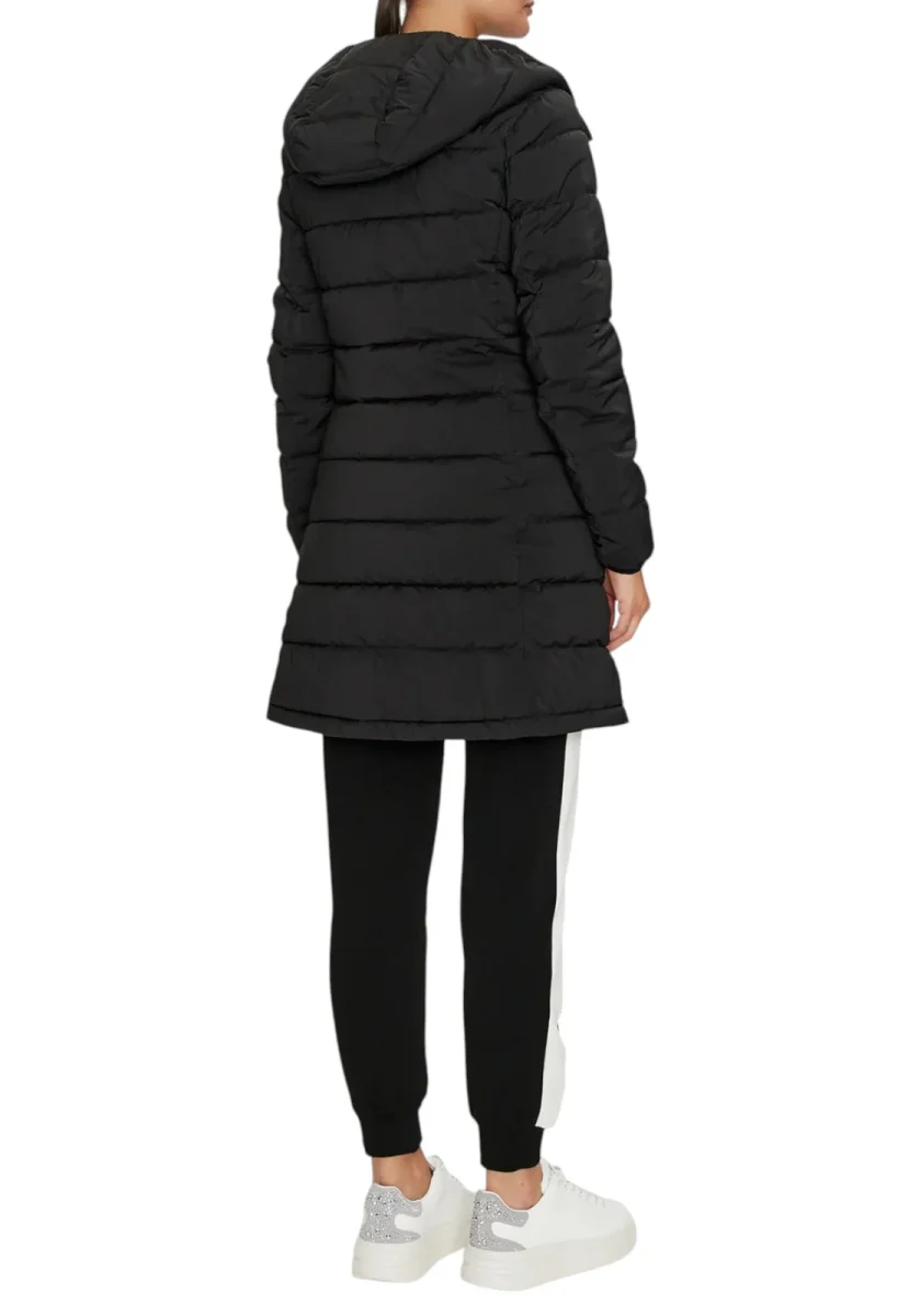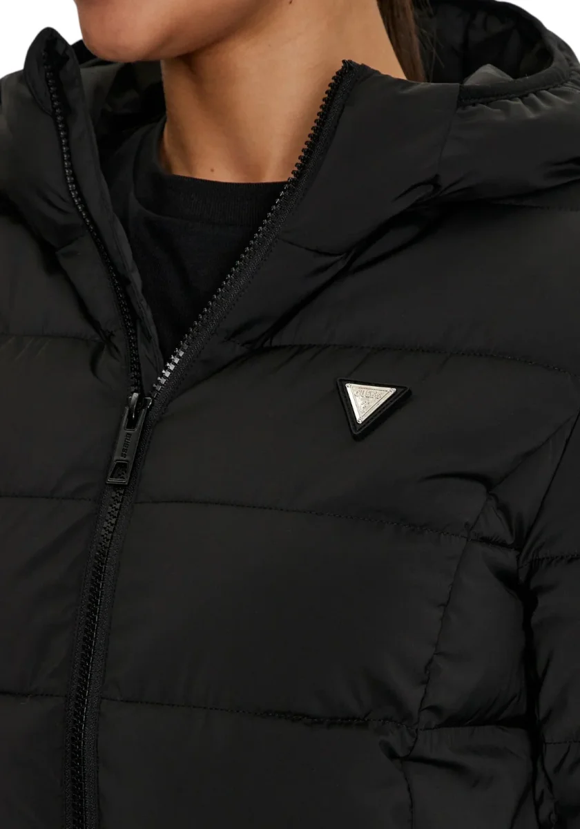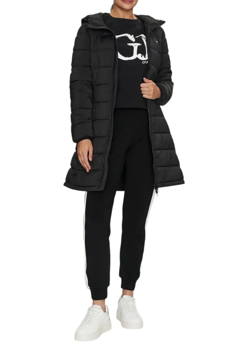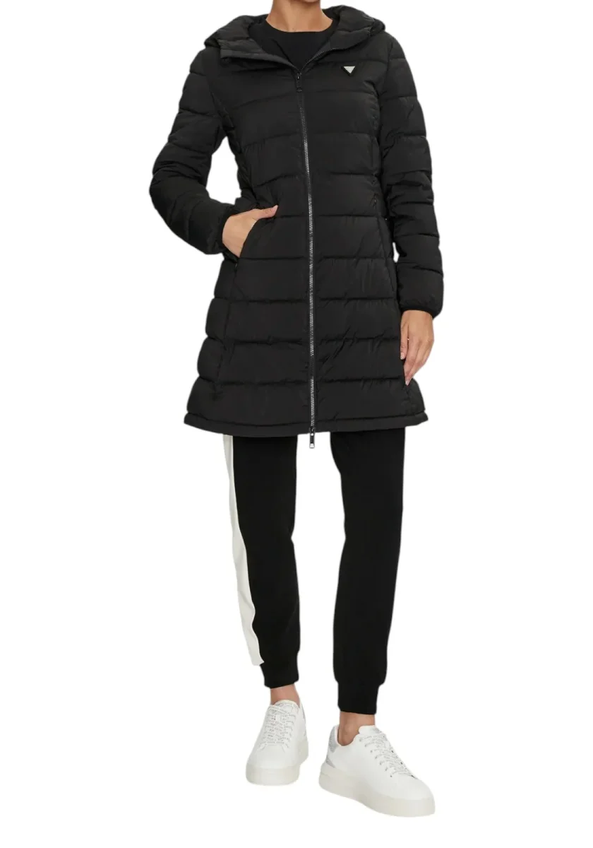 Giacca imbottita dal taglio lungo, caratterizzata da una silhouette aderente e femminile. Chiusura con zip frontale, cappuccio fisso e tasche laterali invisibili. Il design trapuntato garantisce comfort e protezione dal freddo. Dettaglio logo triangolare GUESS sul petto. Ideale per un look casual chic invernale.