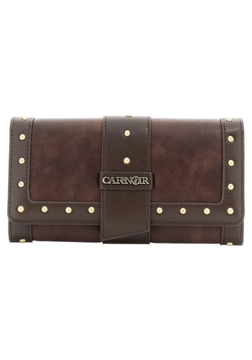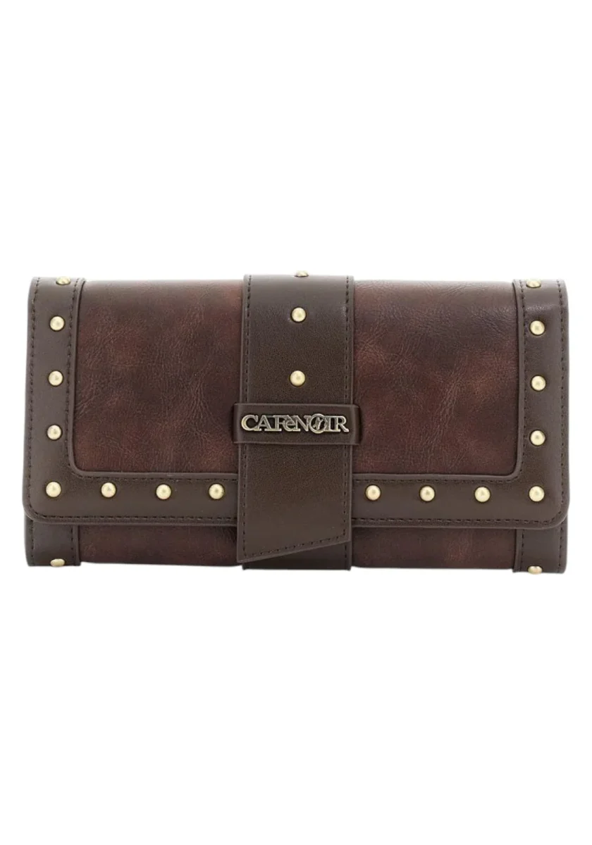 Portafoglio effetto pelle con pattina bordatura e passante con applicazione di rivetti. Vano chiuso con zip lettering in metallo.