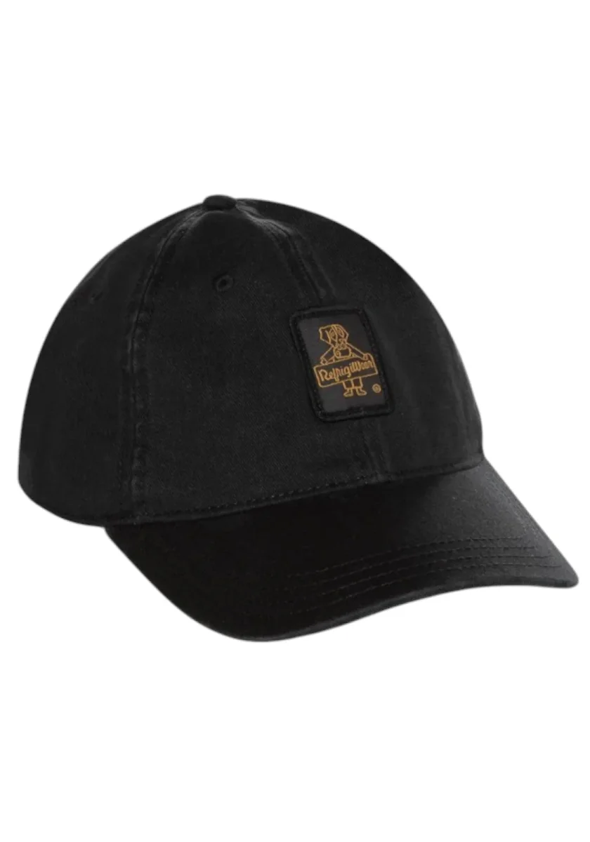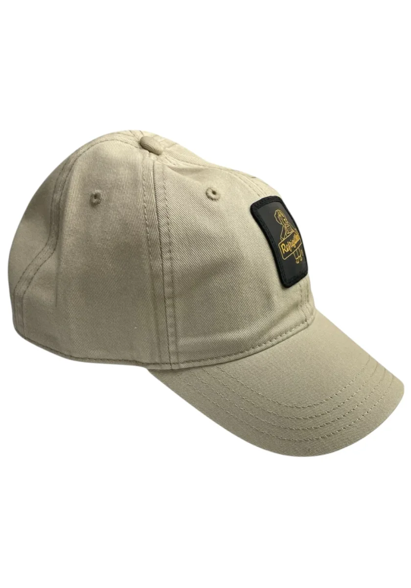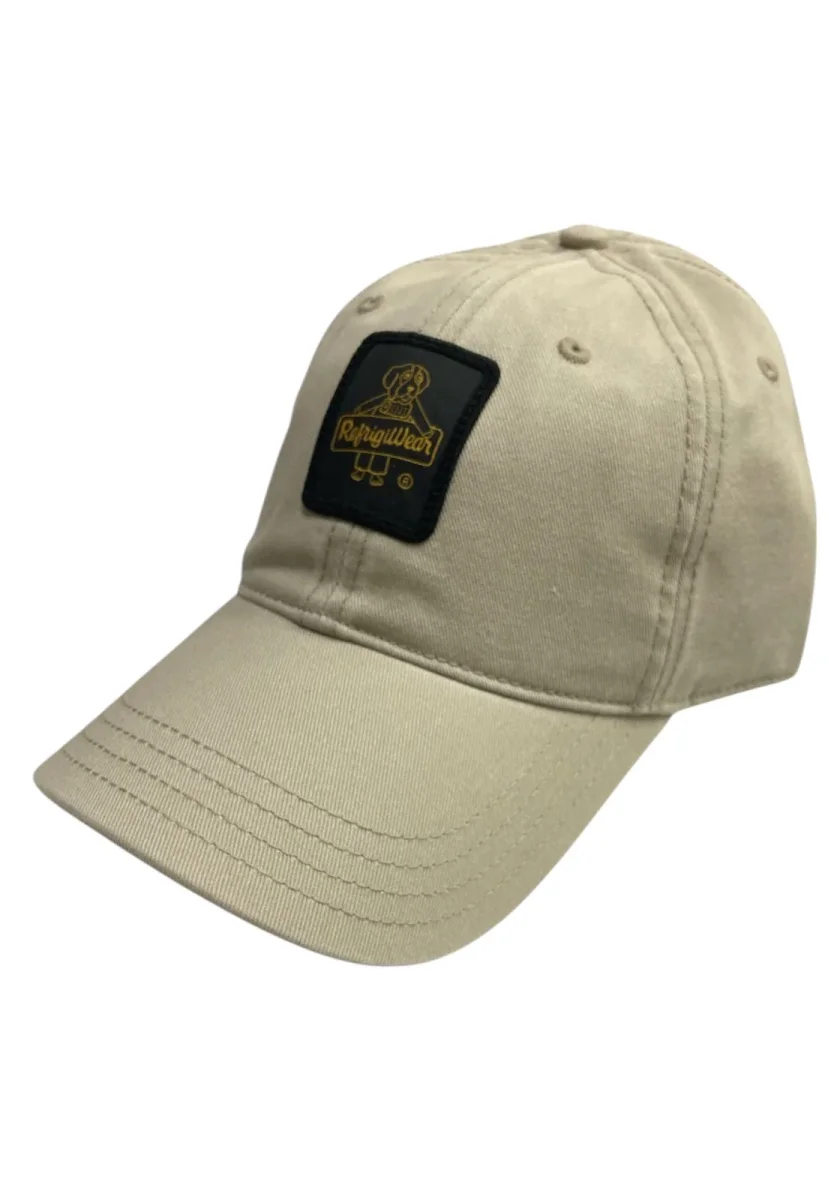 Cappello in cotone beige con visiera curva e regolazione posteriore a bottoni. Logo RefrigiWear in rilievo su toppa nera sul davanti. Design casual e versatile, perfetto per ogni occasione.