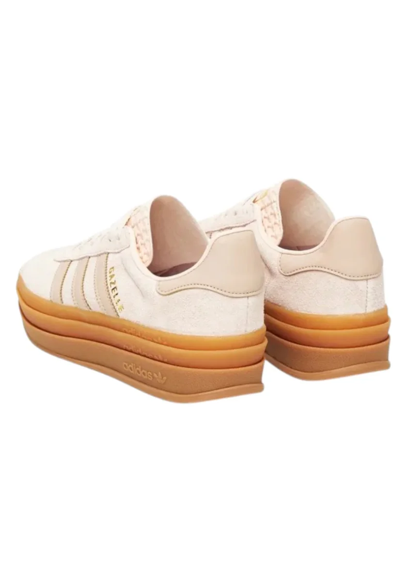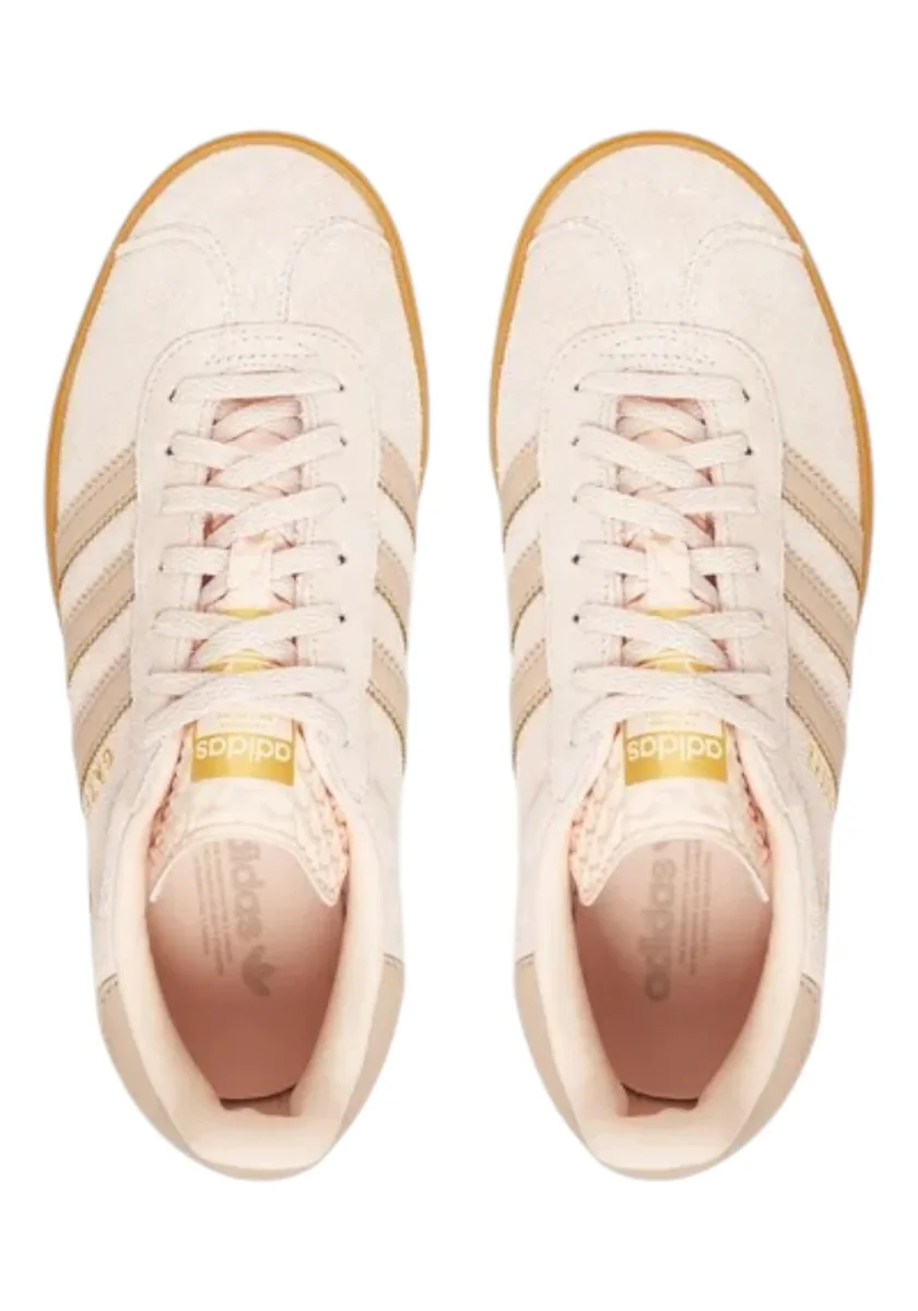 Sneakers dal design retrò con tomaia in suede color crema, caratterizzate dalle iconiche 3 Strisce laterali e dal logo dorato Gazelle . La suola platform in gomma color gum aggiunge un tocco moderno e audace, mantenendo lo stile classico intramontabile di Adidas.