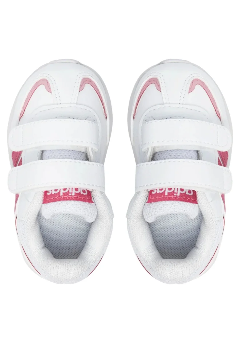 Sneakers Adidas per bambina, modello sportivo in bianco con iconiche 3 strisce rosa. Design con chiusura a doppio strappo per una calzata pratica e veloce, tomaia in materiale sintetico con inserti in mesh traspirante. Suola in gomma antiscivolo, ideali per il tempo libero e le prime attività sportive.