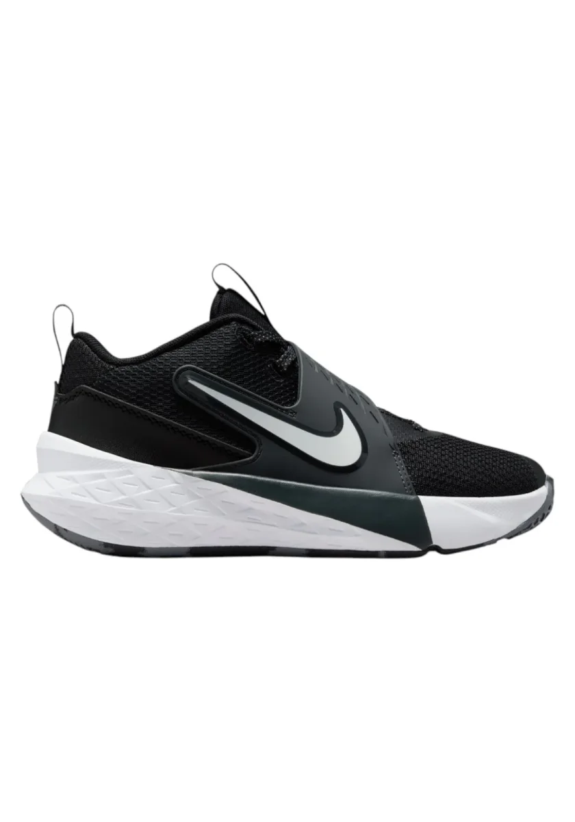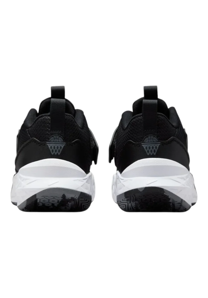 Scarpe da basket per bambini con design moderno e funzionale. Realizzate con tomaia in mesh traspirante, suola in gomma resistente con trazione multidirezionale e chiusura con strap per una calzata stabile. Colore nero con dettagli bianchi e grigi. Ideali per allenamenti e partite.