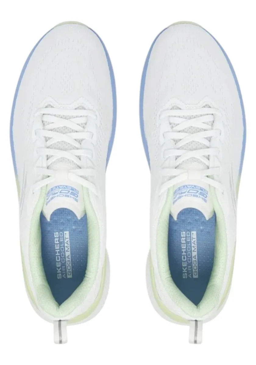 Sneakers da corsa bianche con dettagli verdi e azzurri. Tecnologia Goga Mat™ Air Cooled per massimo comfort e traspirabilità.