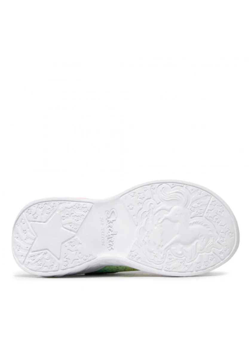 con tonalità di rosa, giallo, verde e viola, con sezioni brillanti. Le scarpe hanno lacci elastici e una chiusura a strappo in velcro.