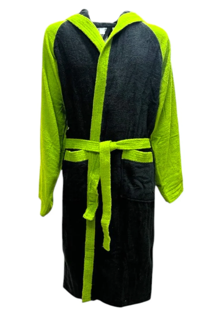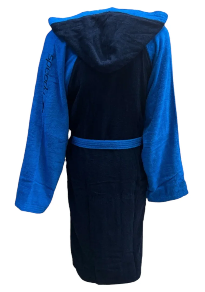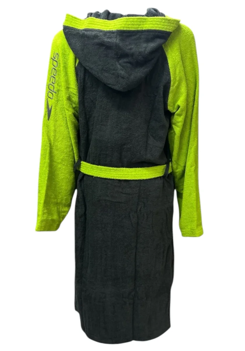 Accappatoio in spugna con cappuccio, maniche lunghe e cintura in vita. Design bicolore nero e verde fluo, con logo Speedo ricamato sulla manica. Perfetto per piscina e attività sportive.