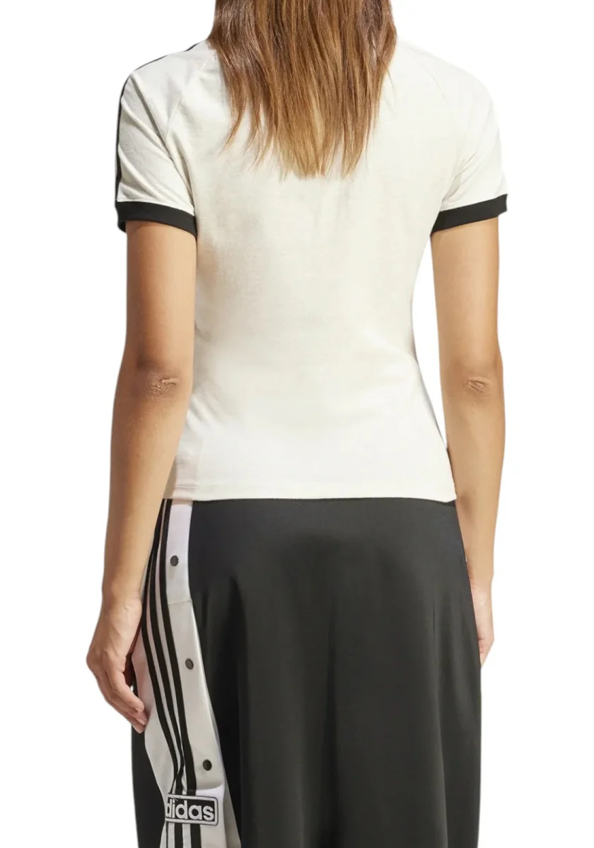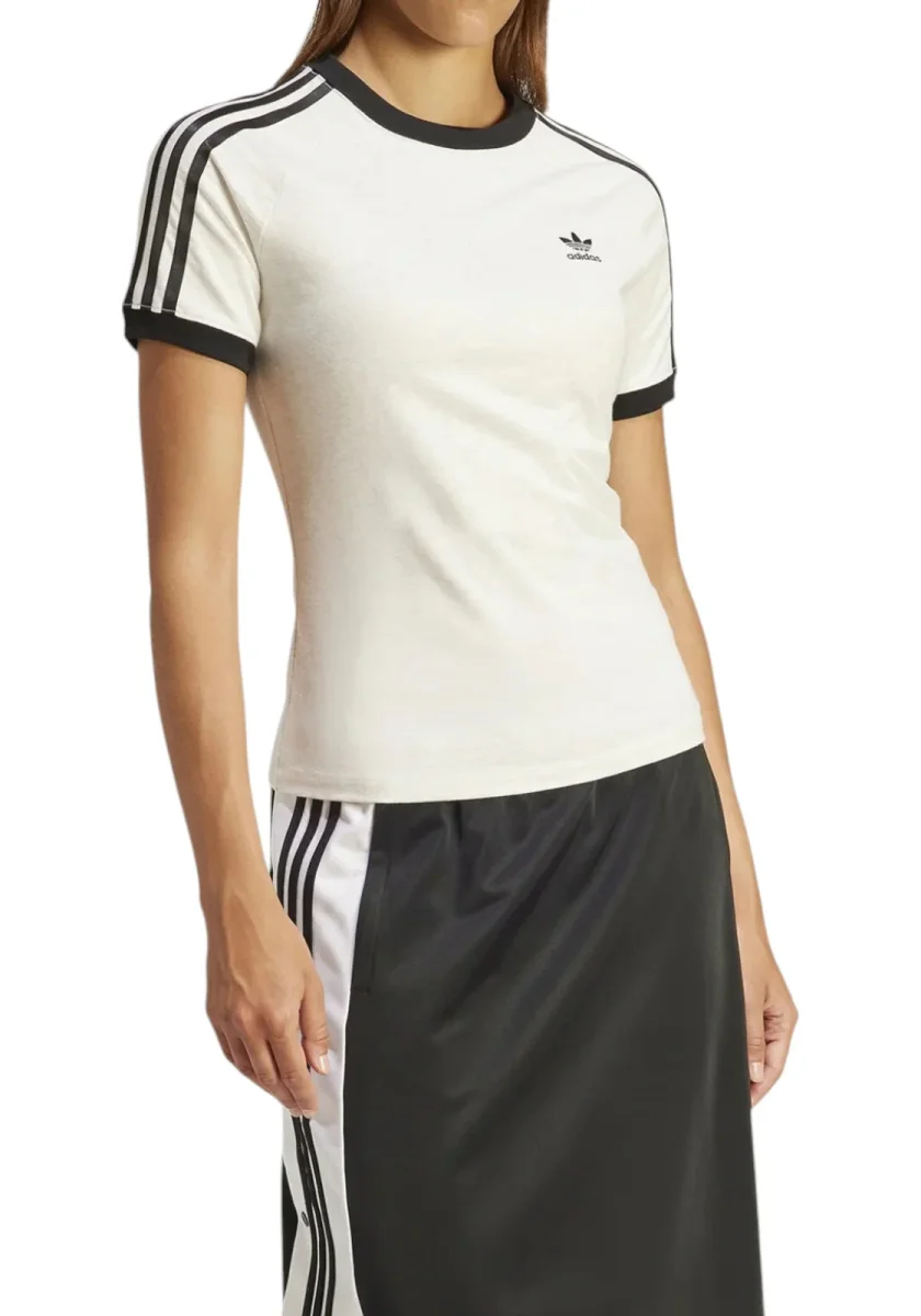 T-shirt slim da donna Adidas Originals, bianca con dettagli neri e iconiche 3 strisce sulle maniche. Design vintage sportivo.
