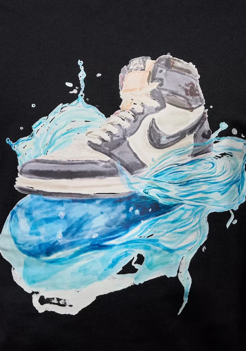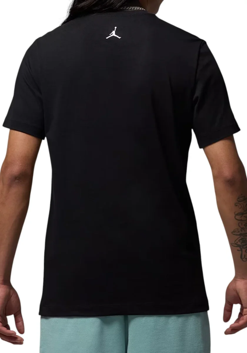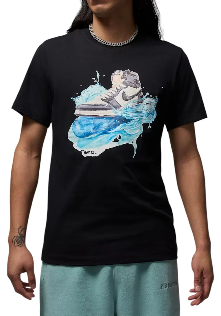 T-shirt da uomo Jordan bianca in cotone con grafica vivace di sneaker su sfondo ad effetto acquerello. Logo Jumpman sul retro. Perfetta per gli amanti del basket e dello streetwear.