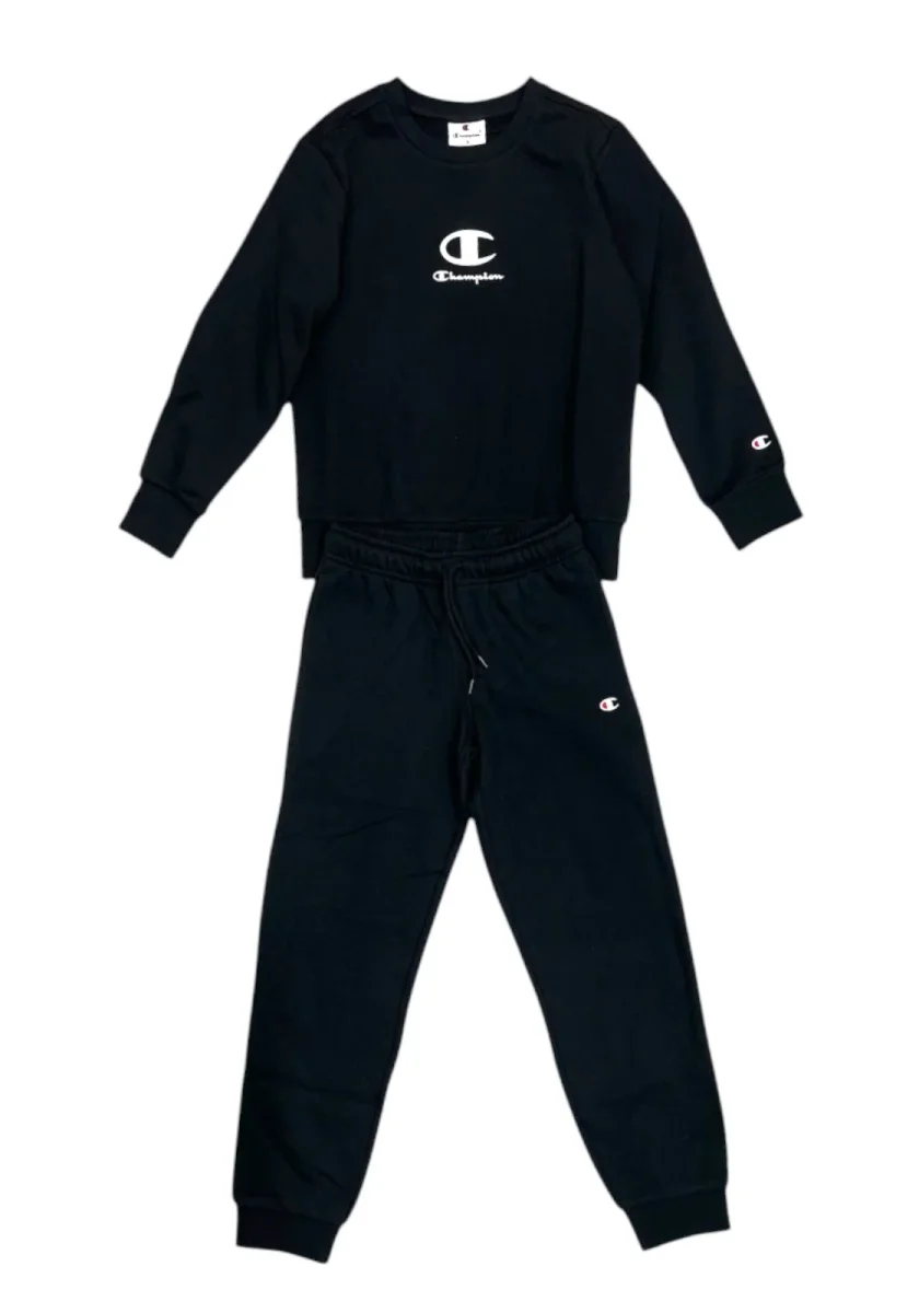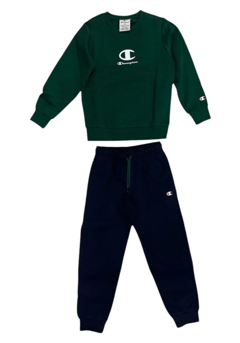 Completo CHAMPION in cotone, composto da felpa girocollo e pantaloni con coulisse. Logo Champion stampato sul petto, sulla manica e sul pantalone. Ideale per sport, scuola o relax.