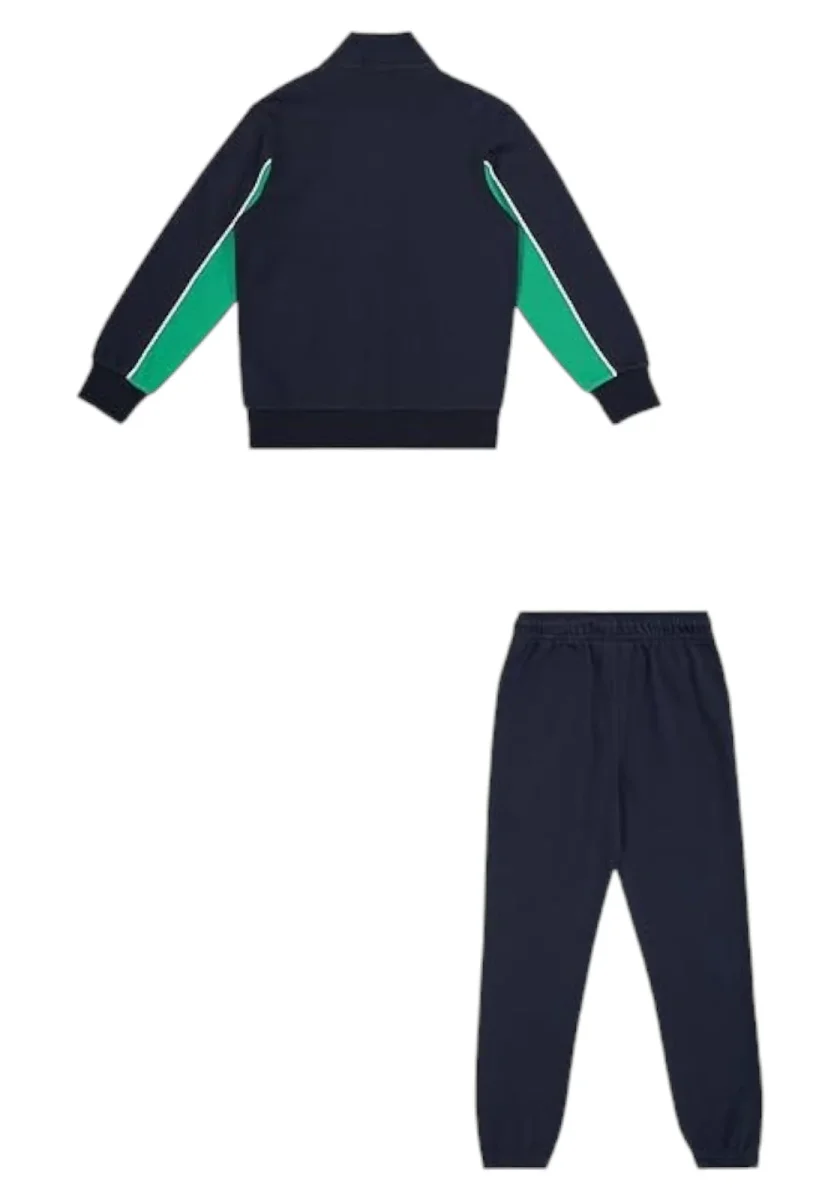 Un completo sportivo per bambini firmato Champion, composto da giacca con zip e pantaloni abbinati. La giacca presenta un design bicolore con dettagli verdi sulle maniche e una fascia sul petto con il logo Champion a contrasto. I pantaloni, con elastico in vita e polsini alle caviglie, garantiscono comfort e libertà di movimento. Perfetto per l’attività sportiva o per il tempo libero con un look casual e alla moda.