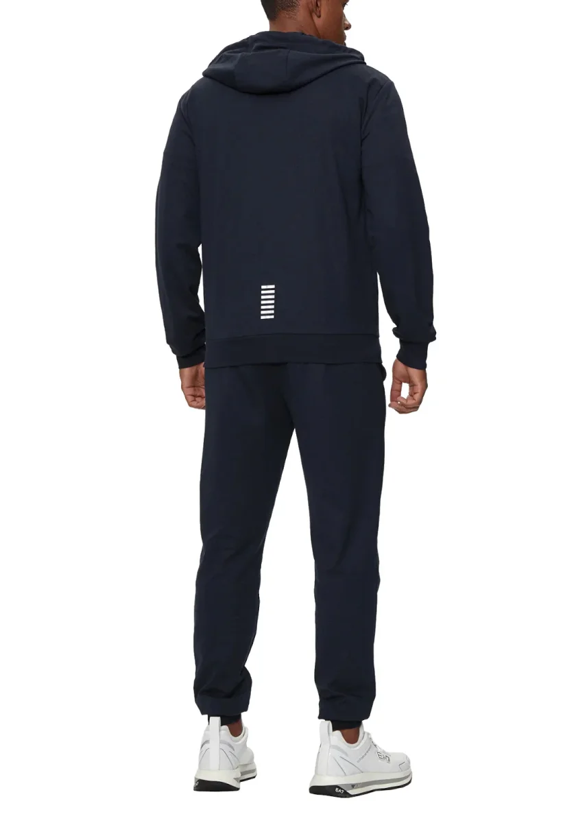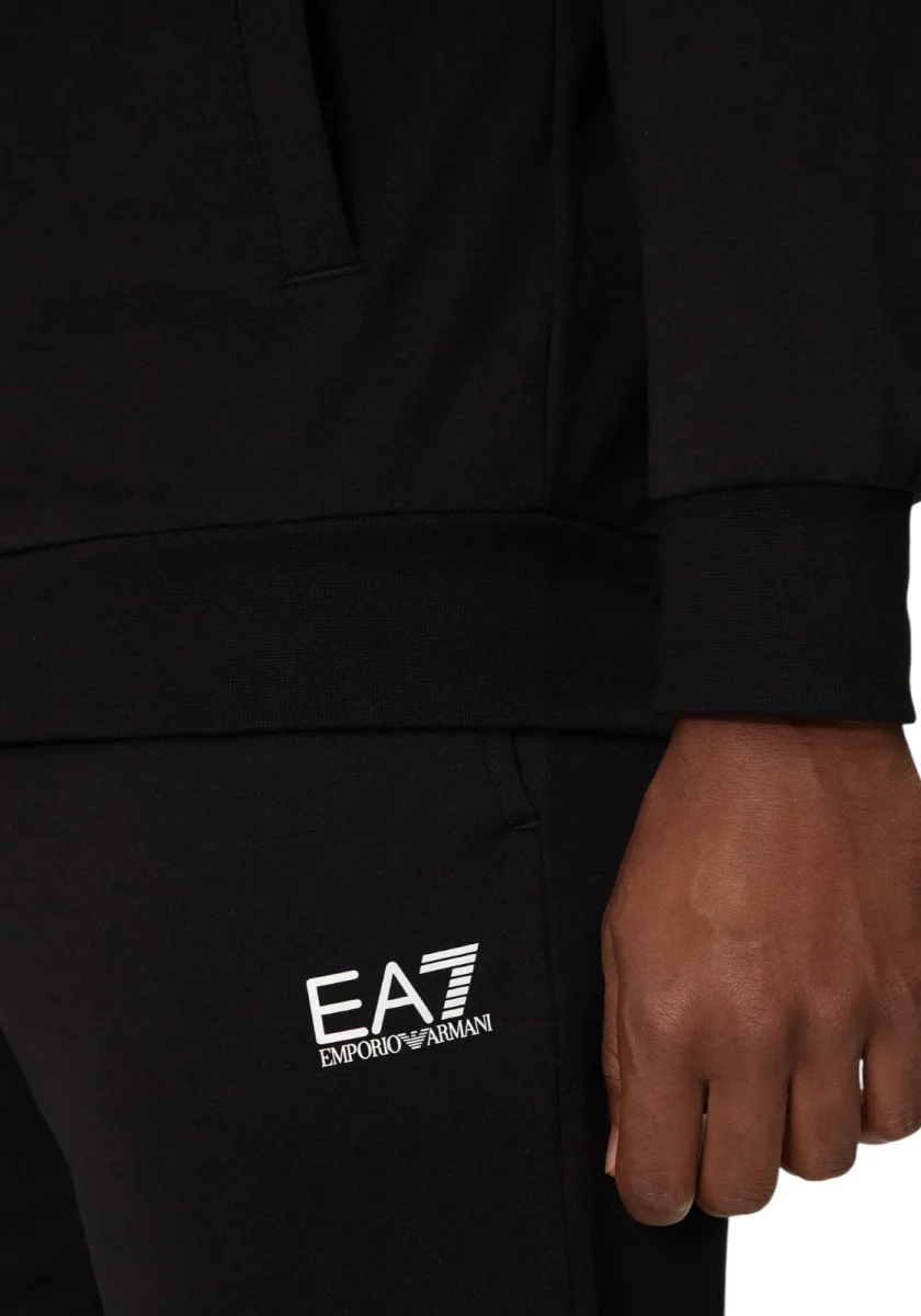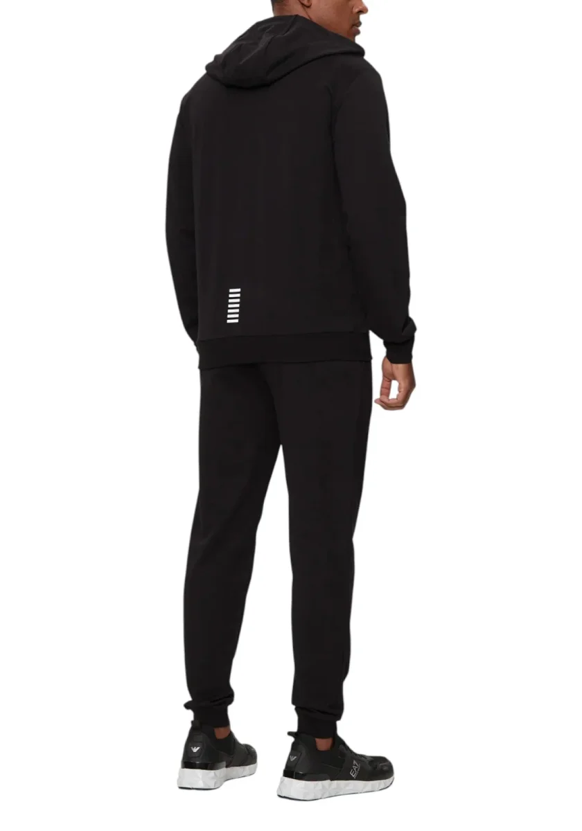 Tuta realizzata in morbido cotone. Il modello si compone di una felpa con zip e cappuccio e pantaloni jogger con coulisse in vita. Entrambi i capi sono personalizzati dall’iconico logo EA7 a contrasto.