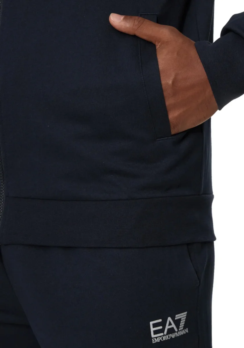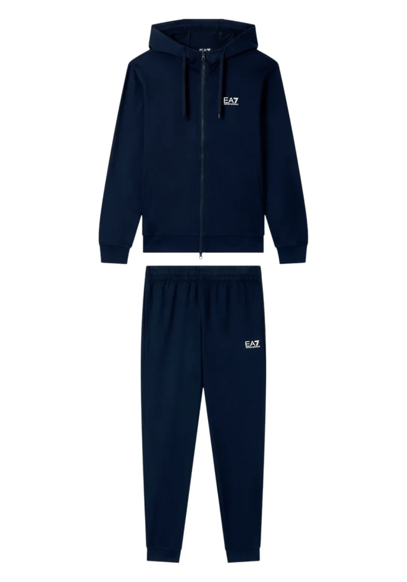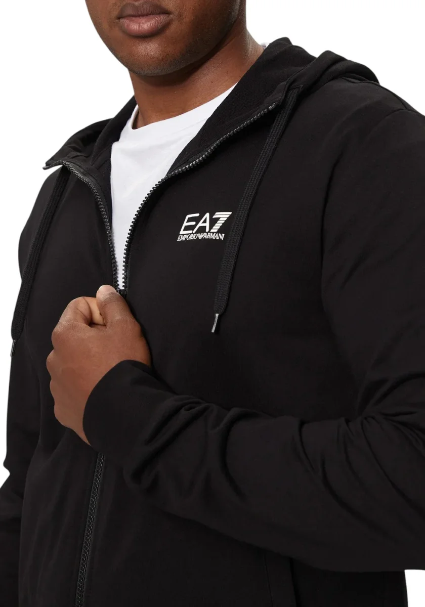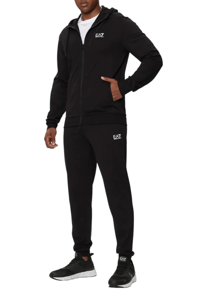 Tuta realizzata in morbido cotone. Il modello si compone di una felpa con zip e cappuccio e pantaloni jogger con coulisse in vita. Entrambi i capi sono personalizzati dall’iconico logo EA7 a contrasto.