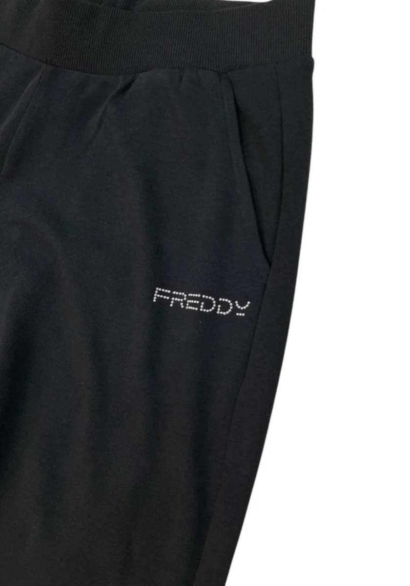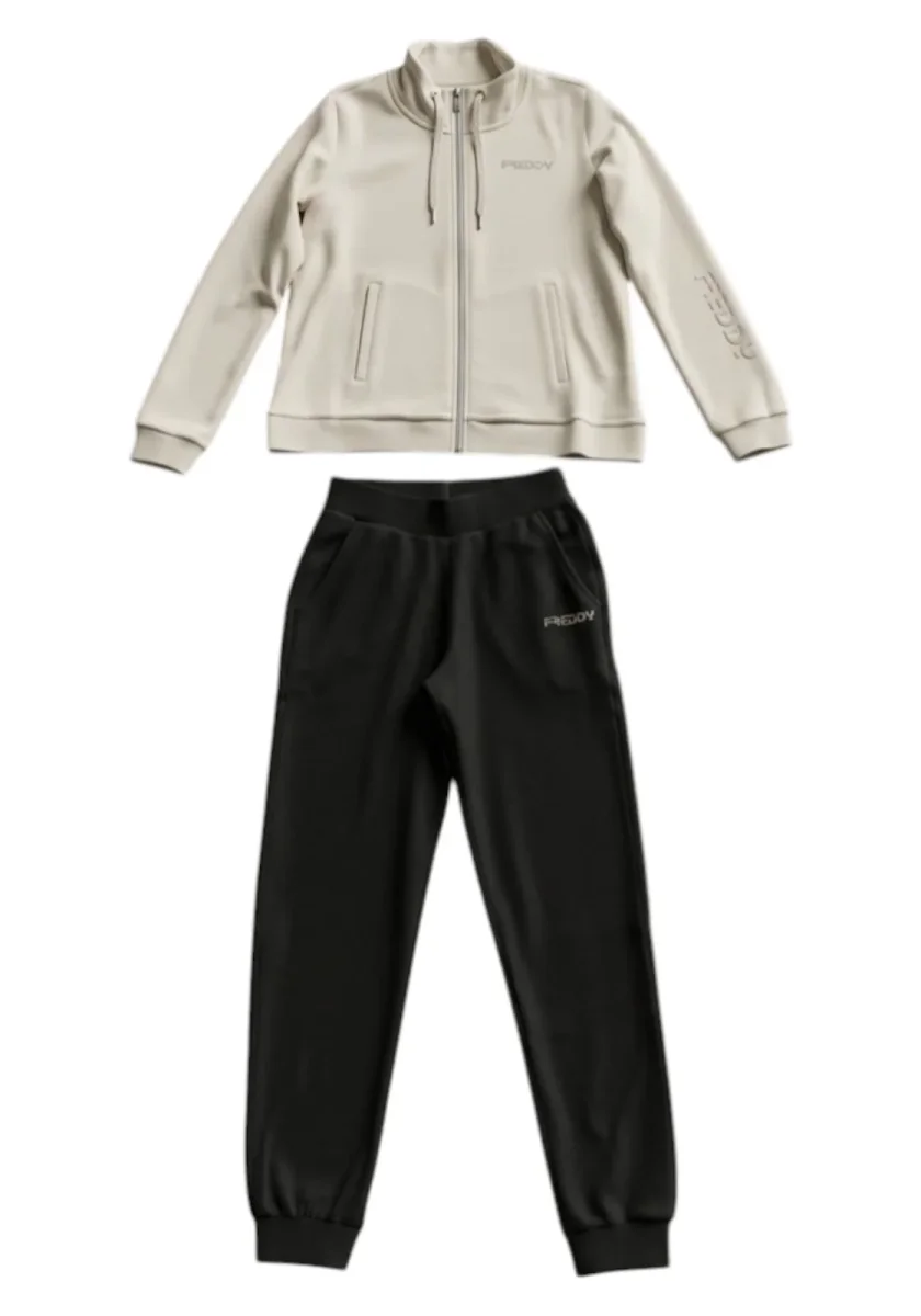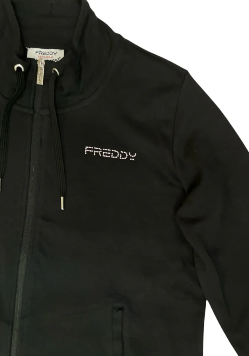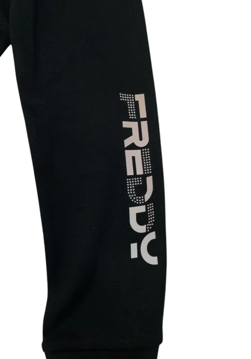 Tuta da donna Freddy dal design sportivo e moderno, perfetta per il tempo libero e l’attività quotidiana. Il completo è composto da felpa con zip frontale, collo alto e pratiche tasche laterali, arricchita da logo sul petto e sulla manica. I pantaloni presentano vita elasticizzata con coulisse, tasche laterali e fondo con polsino per una vestibilità comoda e femminile. Realizzata in tessuto morbido e confortevole, ideale per un look casual e dinamico.